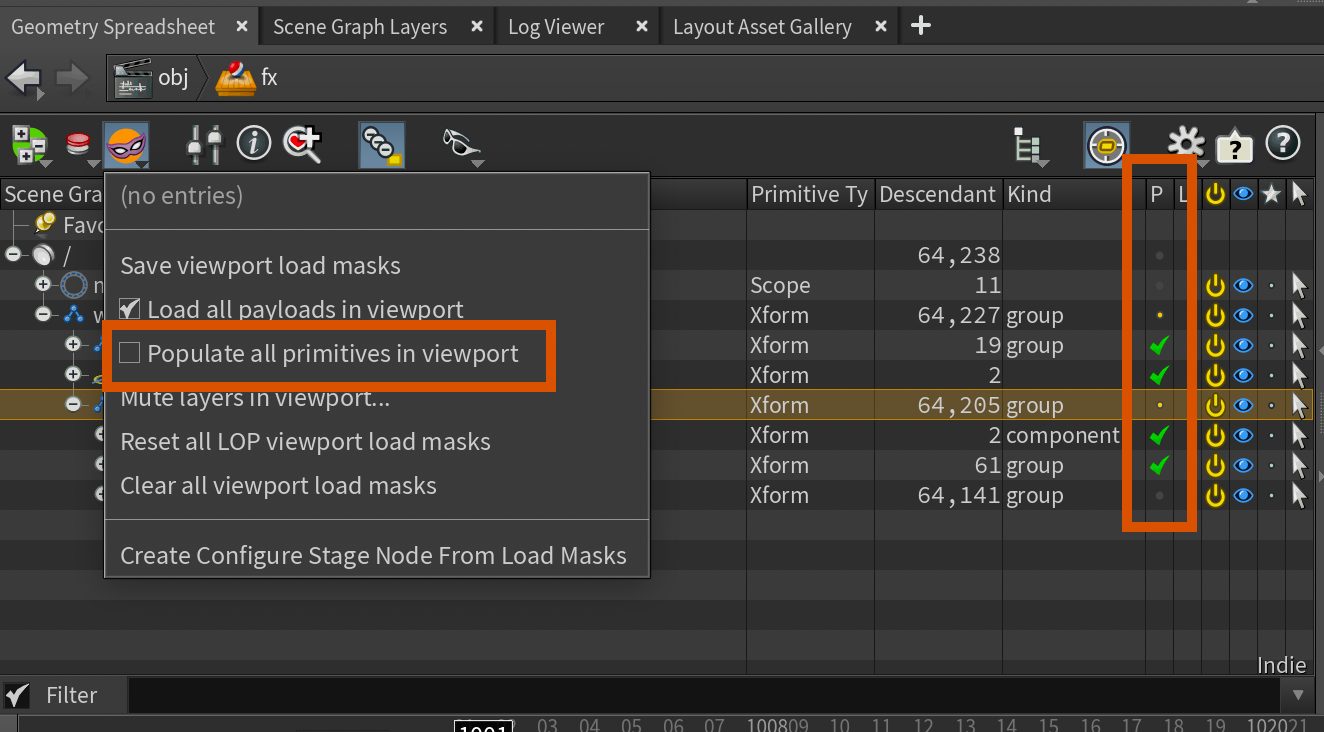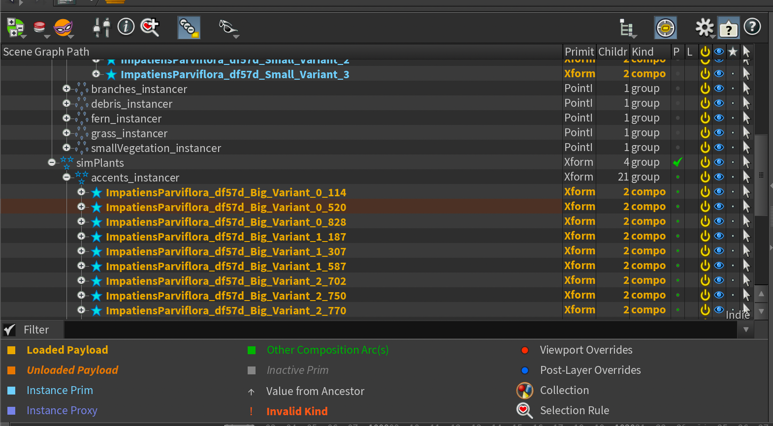 Things can get a bit heavy when you have a lot of instancers in the viewport. In order to speed things up I recommend using the "Populate Mask" by unchecking Populate all primitives in viewport like you see below. This allows you to toggle which parts of the scene you want to load.