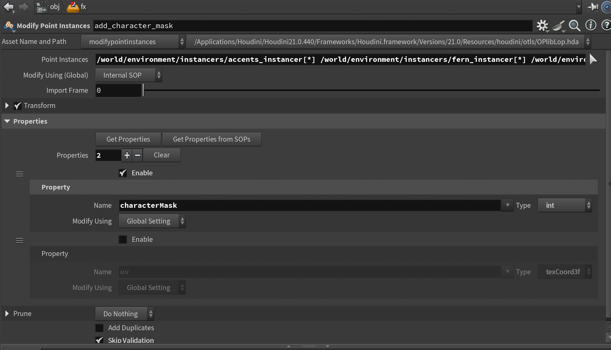 On the Modify Point Instances I added the point instances I waned to load in. Remember you need the little [*] at the end of each prim path to select all instances in the given instancer. I also added the property characterMask to make sure the mask is exports. Note that it's of type int since I either want it on or off (0 or 1).