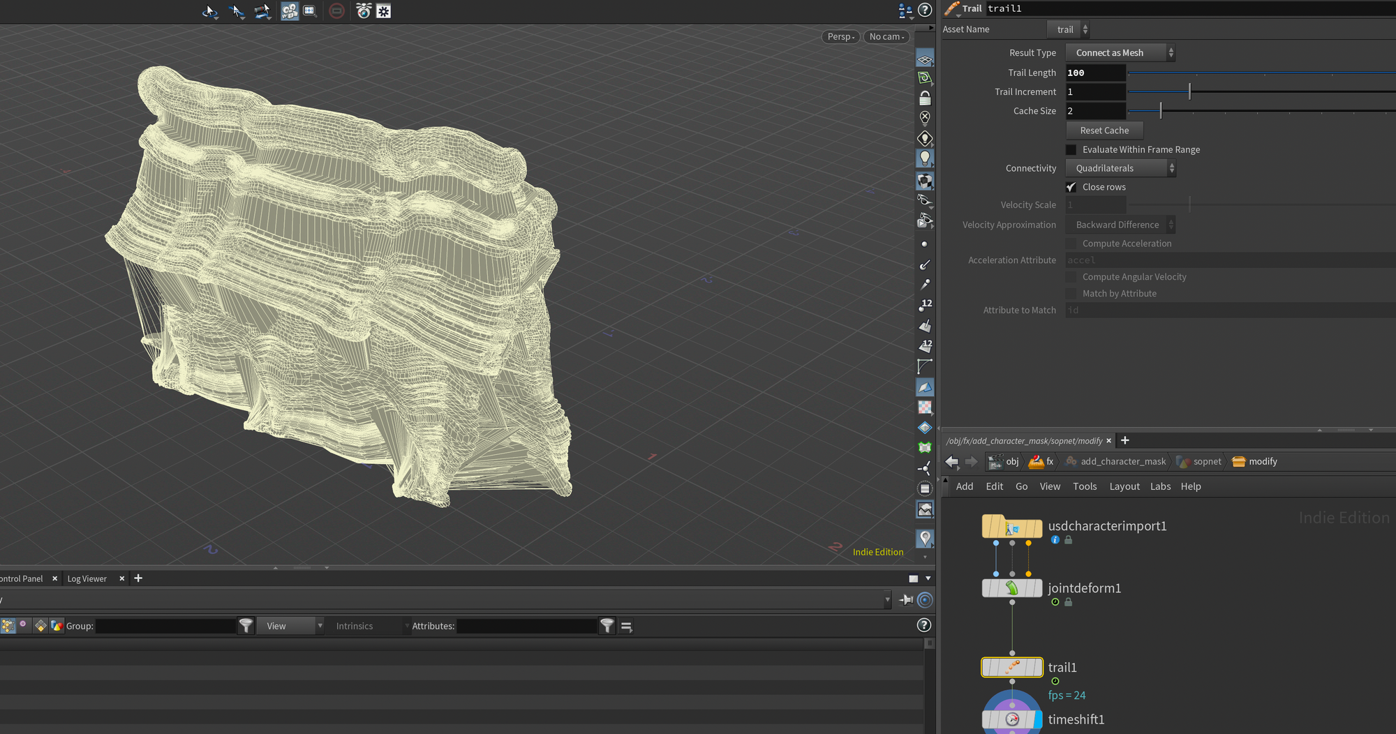 Following that, I plug the output of the Joint Deform directly into a trail node set to Connect as Mesh with a trail length of 100. I then take that output and plug it into a time shift set to 1100 (our end frame). This gives us the mesh you see in the screenshot below, allowing us to see where the mesh is throughout our whole range. If you wanted to make this faster you could increase the Trail Increment.