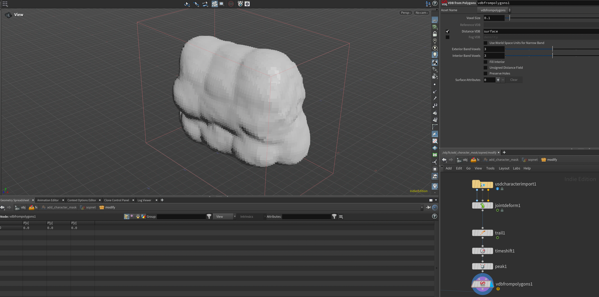 Finally, I pipe in a Peak node to push things out a bit and finally a VDB From Polygons to create this blob that I'll use as an input in a group node to mask the instances that come into contact with our character throughout our shot.