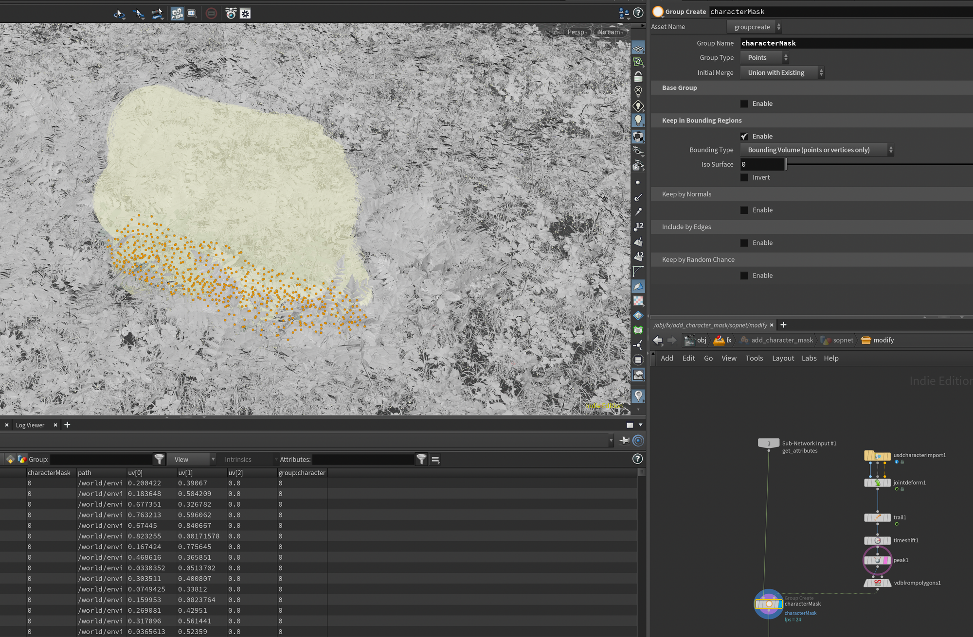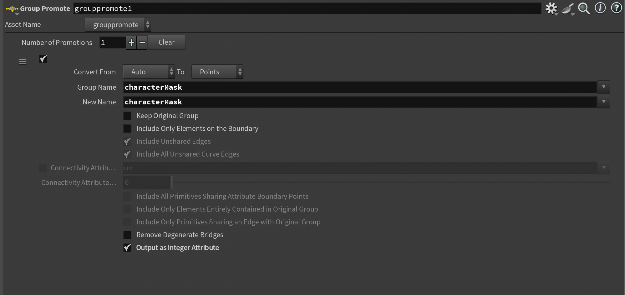 characterMaskFinally, I added a Group Promote to promote this from a group to a point attribute that we can access more easily in LOPs. Remember to check Output as Integer Attribute.