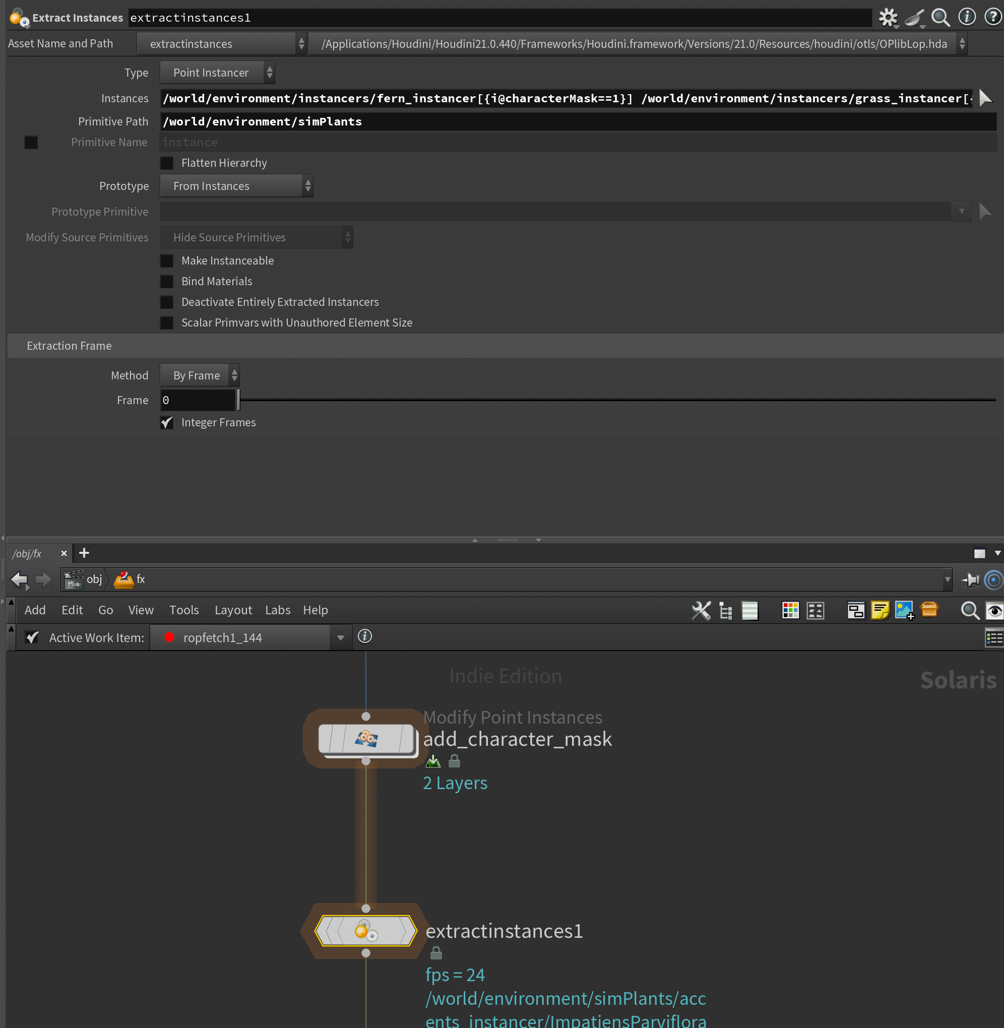 The easiest way to achieve that is to use an Extract Instances node in LOPs. Within this we can use an expression to extract only the pieces of vegetation we marked with the attribute characterMask in the previous section. We do that using the following expression: