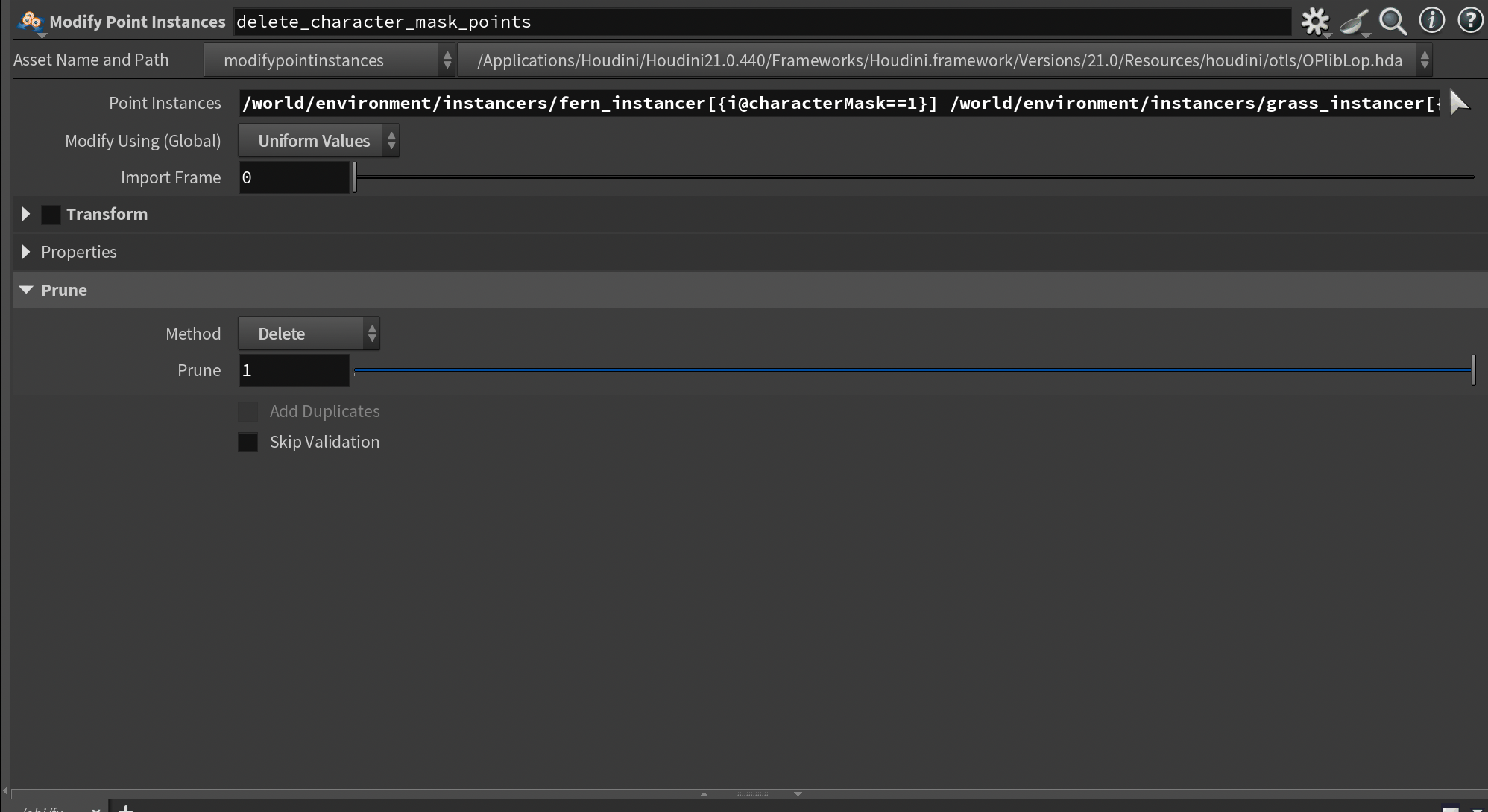 In order to achieve this, I first added a Modify Point Instances node to add a mask consisting of the vegetation instances we want to simulate. Please be advised that this node is a little slow to work with - if you're lucky, your studio might have a faster node for modifying point instancers.
