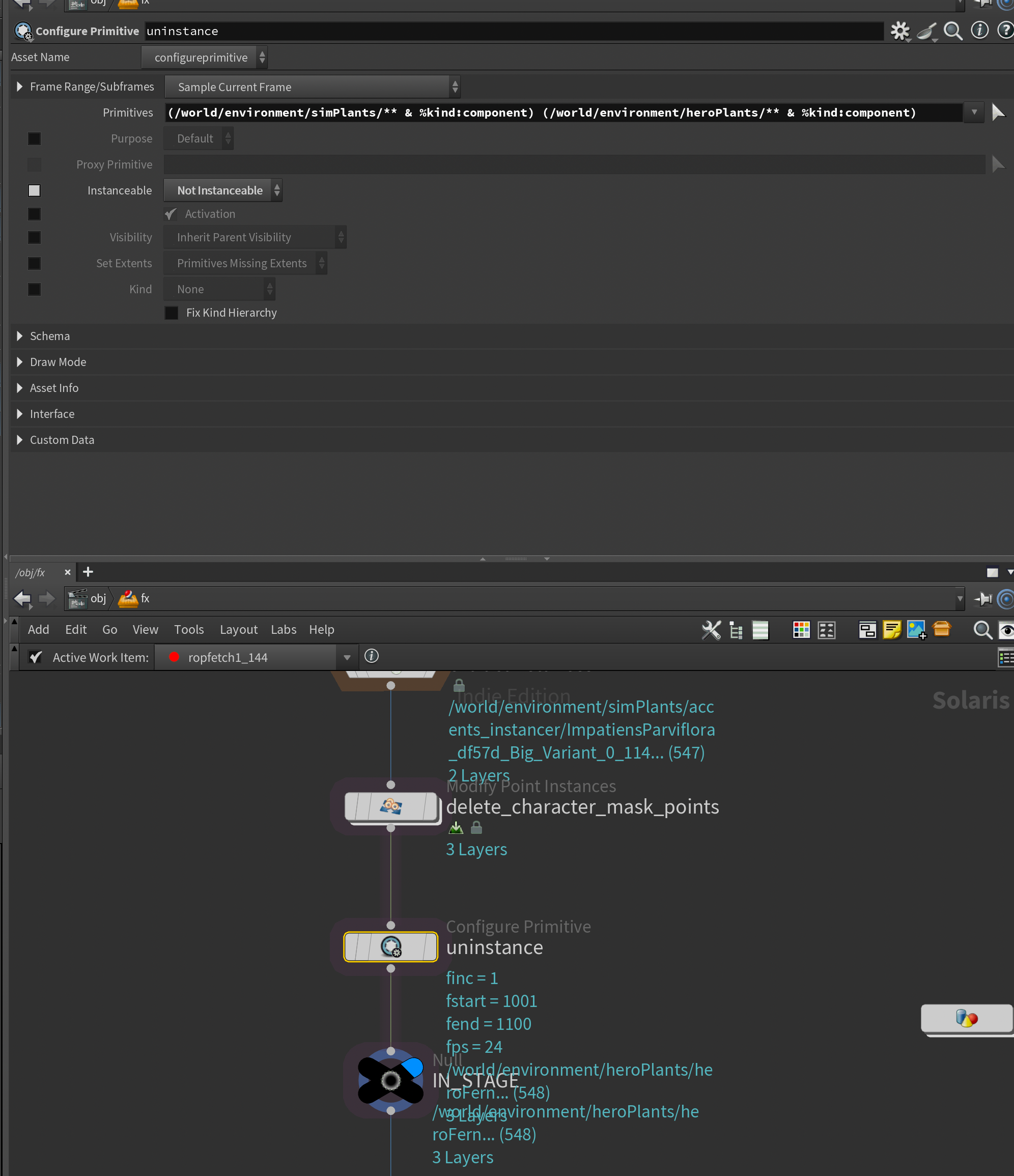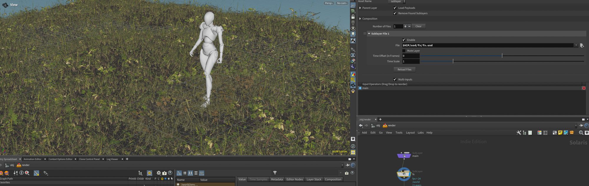 Chained directly after that I created another sublayer loading our fx.usd file. This contains the overrides we made to the instancers (disabling the extracted vegetation) + our animation for our vegetation agents.