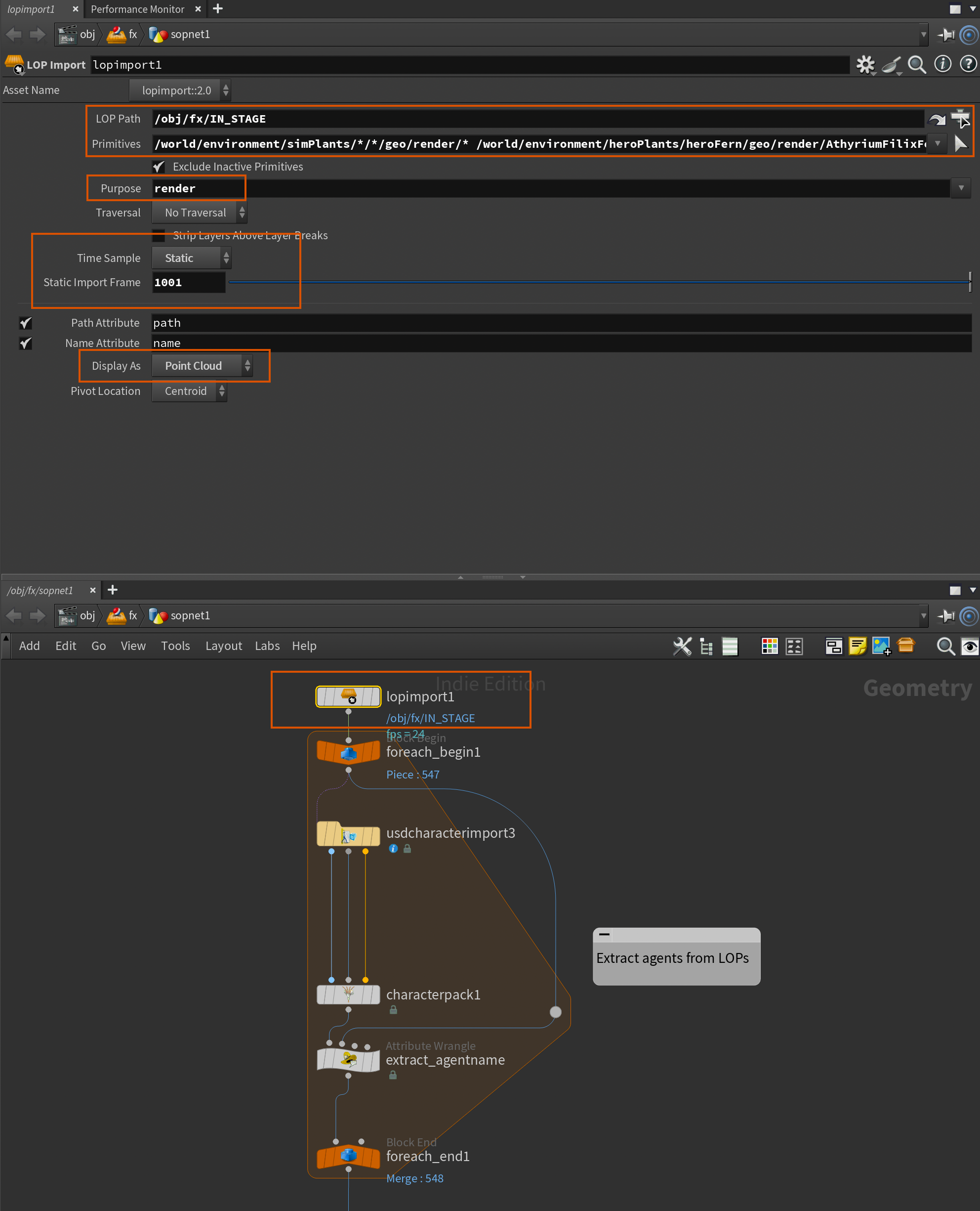 `prims("../foreach_begin1", 0, "path")`This grabs the path attribute of the current primitive in the For Each loop and allows us to import the "character" (vegetation in our case).
