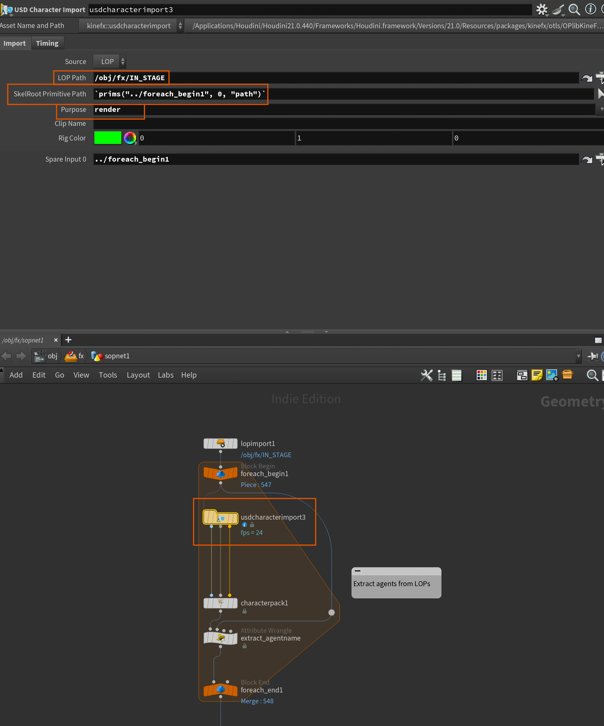 Inside the Modify Point Instances , in the SOP context, I added a USD Character Import node to load our animation from LOPs to SOPs with the following parameters. The LOP Path and Primitive Path might be different depending on your setup.