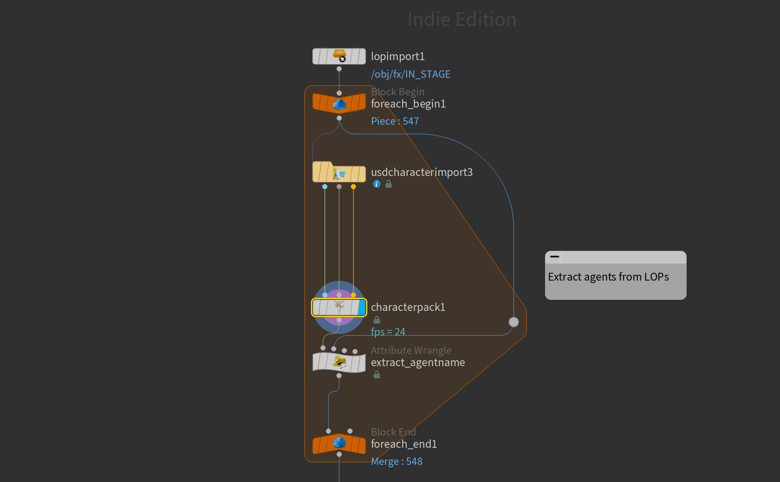 Then we need to extract our agents from LOPs into SOPs. This is unfortunately not super elegant, as I need to rely on a For-Each loop because the USD Character Import node can only import one character at a time.
