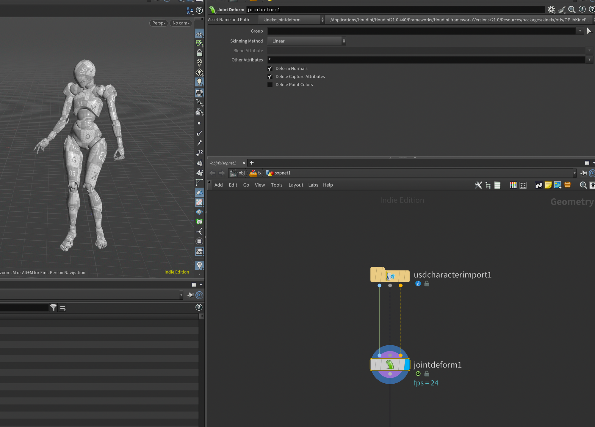 USD Character ImportI then plug in the results of the USD Character Import into a Joint Deform node to get our animation applied to our skinned geometry.