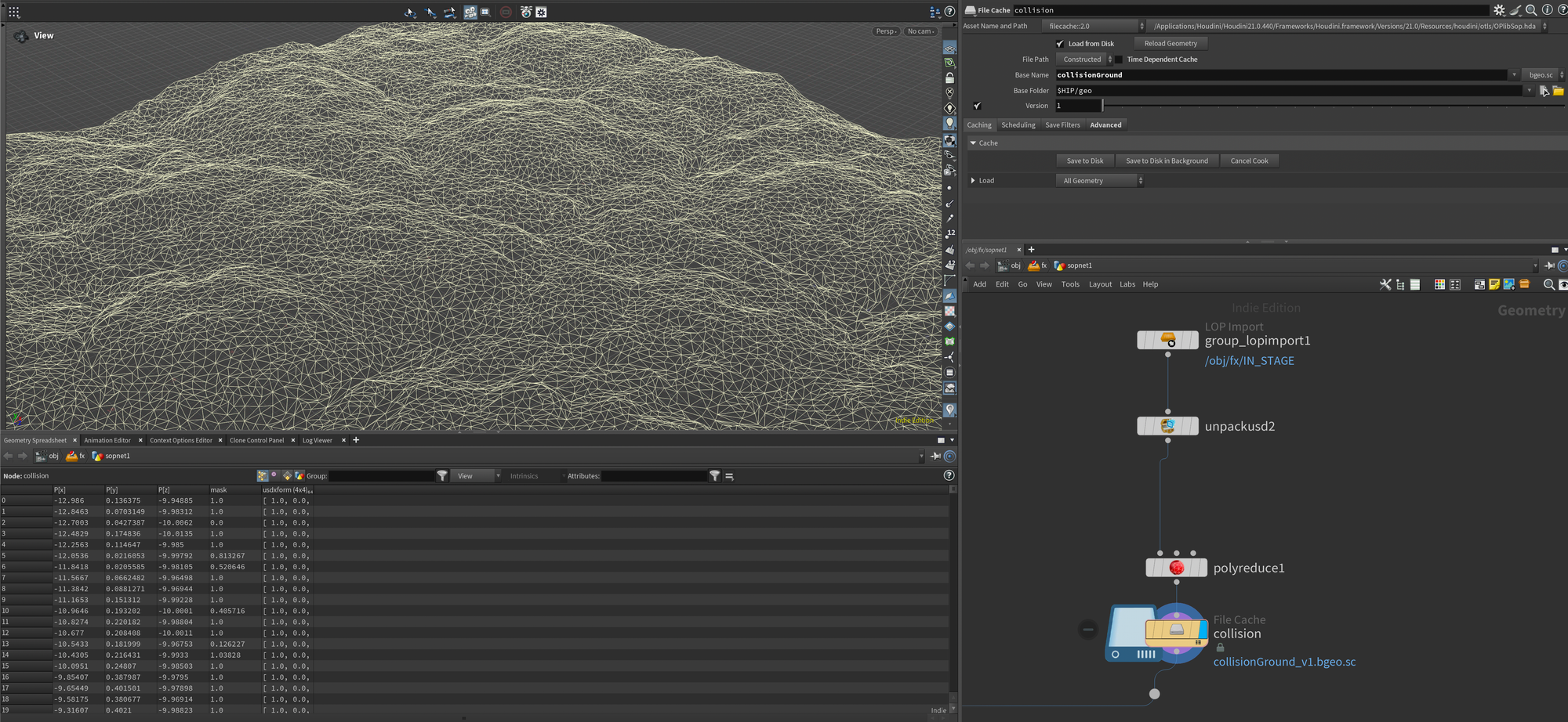 Next up I want to load in the ground geometry. This is a little simpler, I added a LOP Import targeting the ground primitive, used a Unpack USD To Polygons node to unpack it, and finally added a Poly Reduce to lower to poly count significantly as the mesh was pretty heavy.