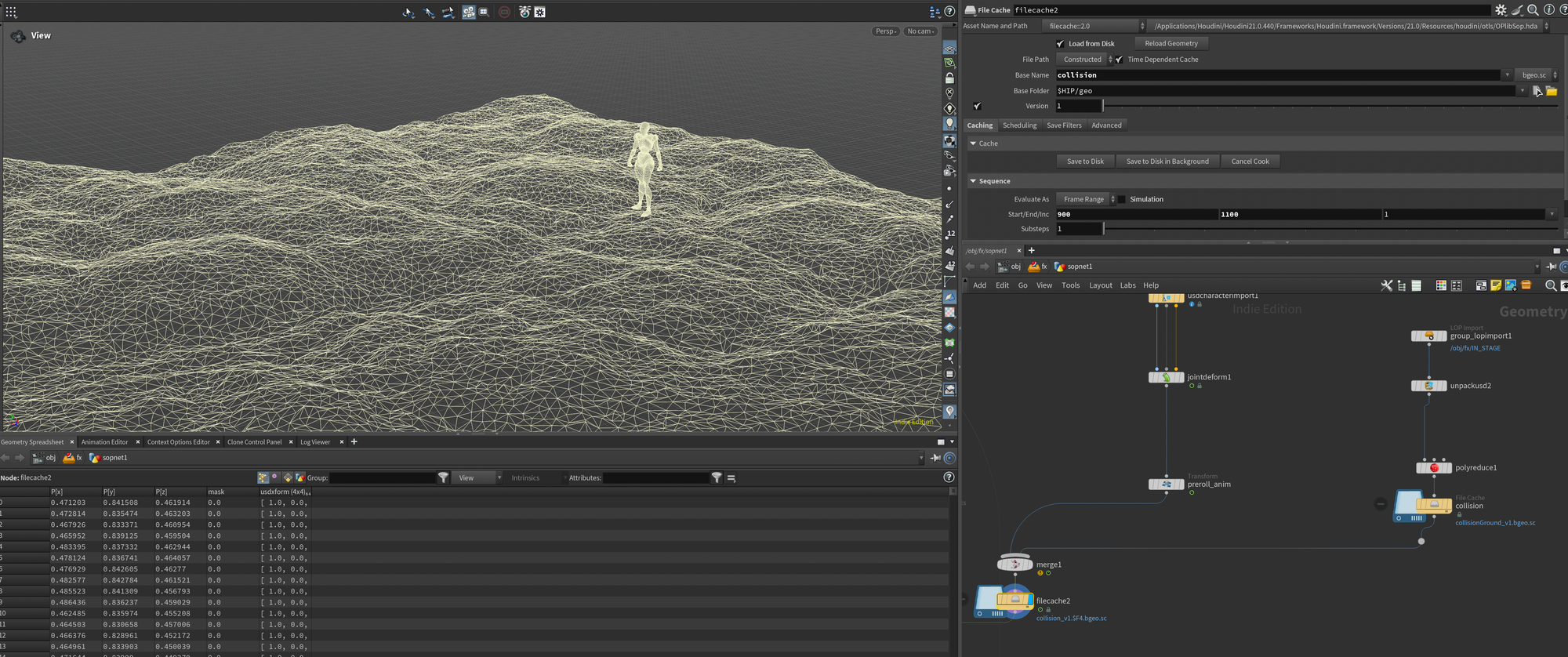 To finish off I merged the two collision elements (ground and character) and cached them to disk using a File Cache node.