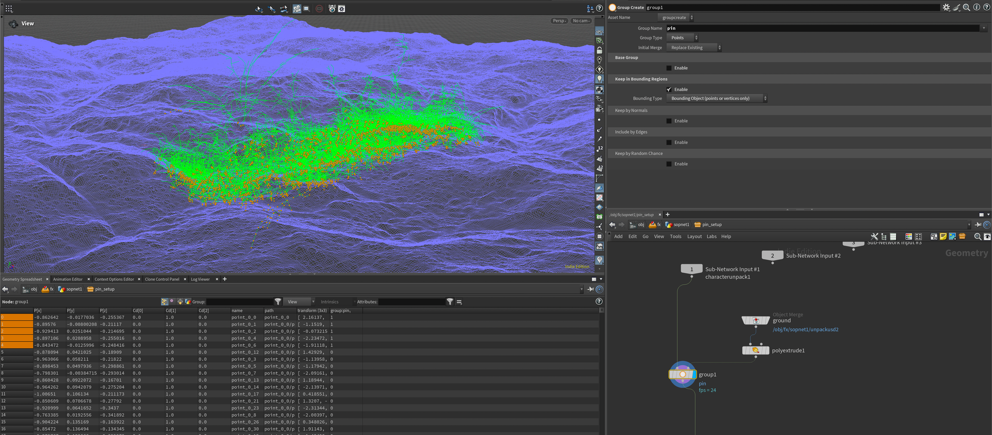 Now, moving back to our skeletons, we need to first set up a pin group for the skeleton. The pin group will be used in our vellum simulation to "stick" the roots of the vegetation to the ground so they don't fly everywhere when the character runs into them.