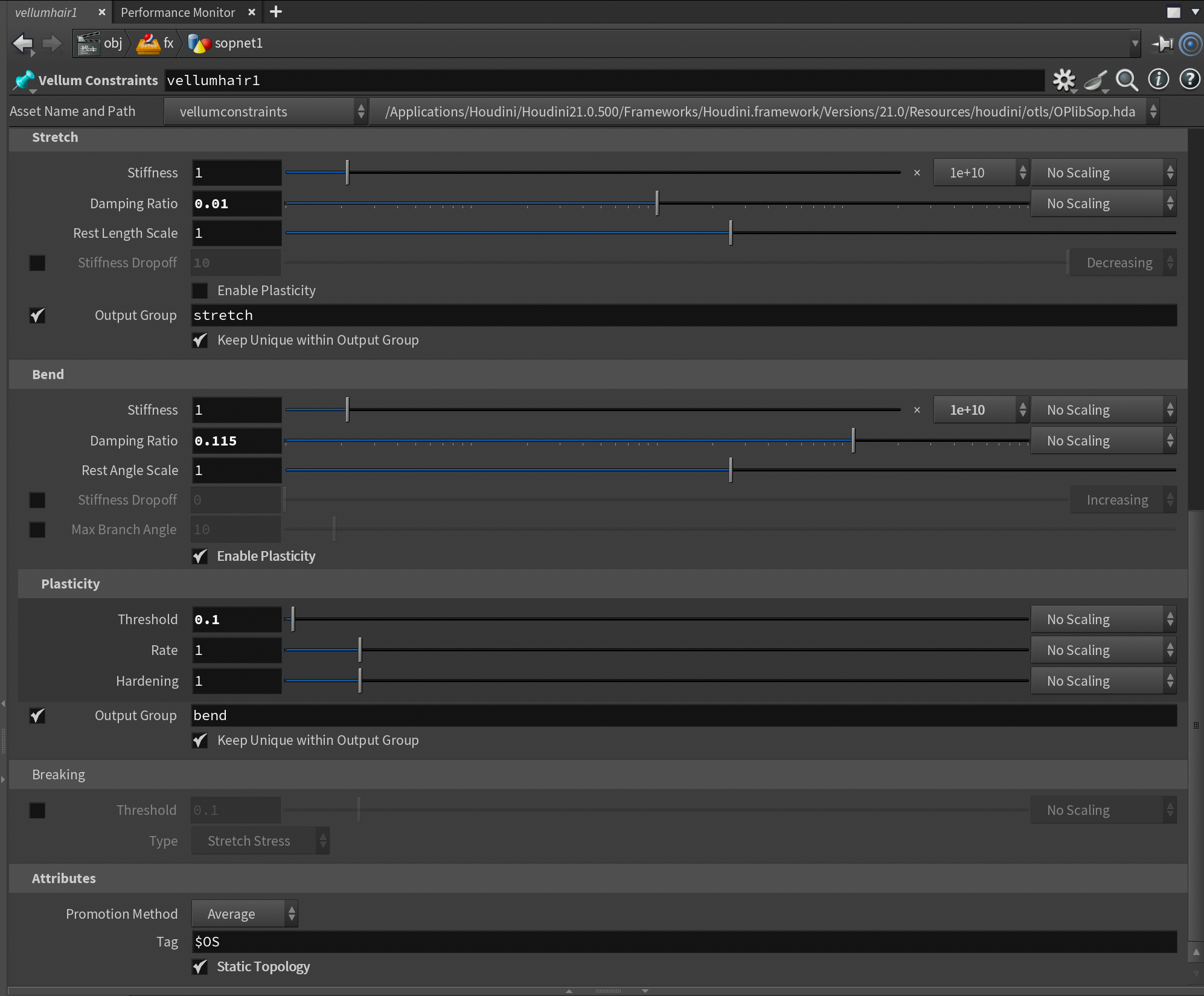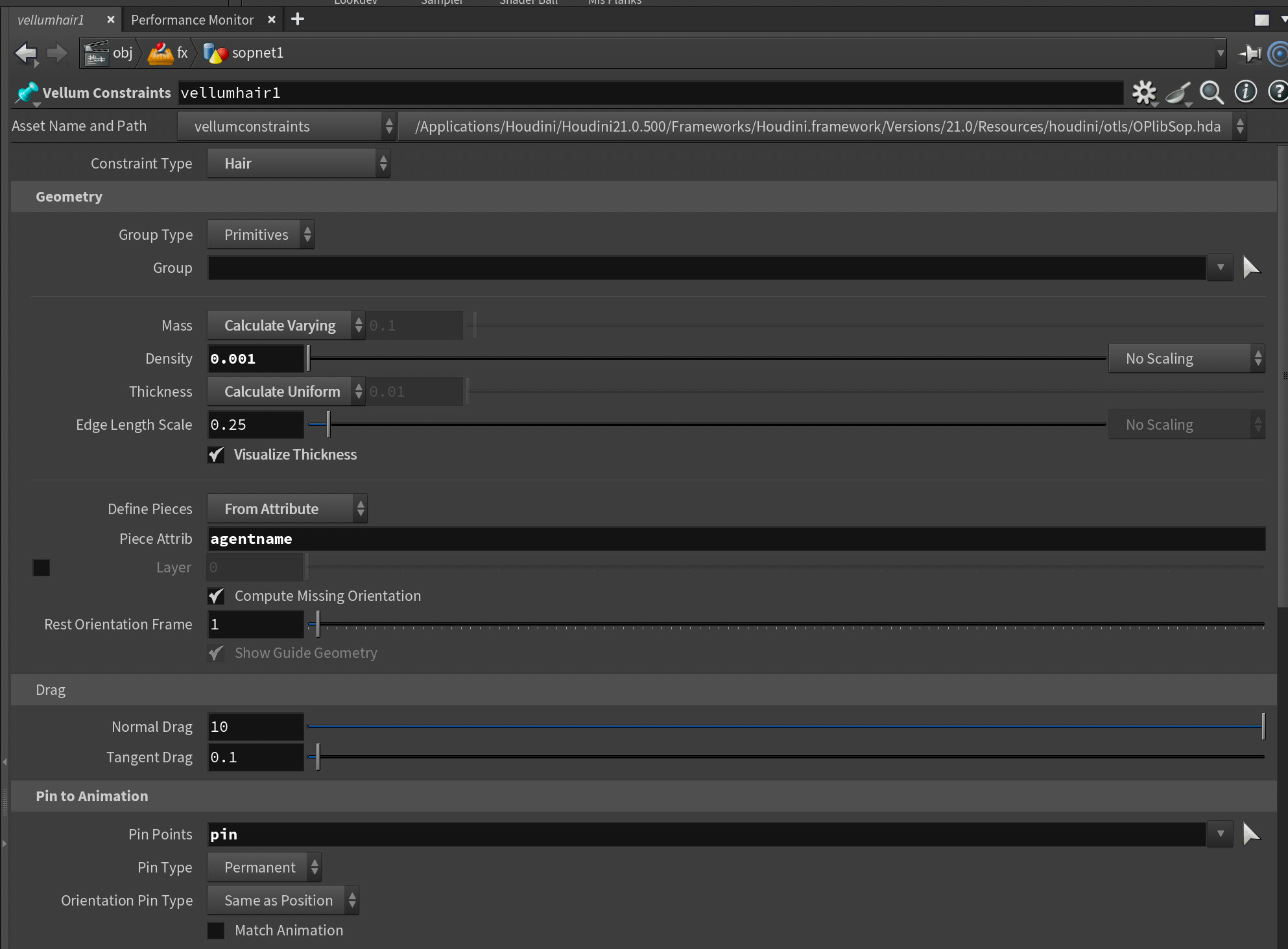 Now, finding the right settings for this takes some trial and error (at least it did for me), as it depends a lot on geometry resolution and scene scale. I'll share the settings I used in the Vellum Constraint node below, but keep in mind your milage may wary.