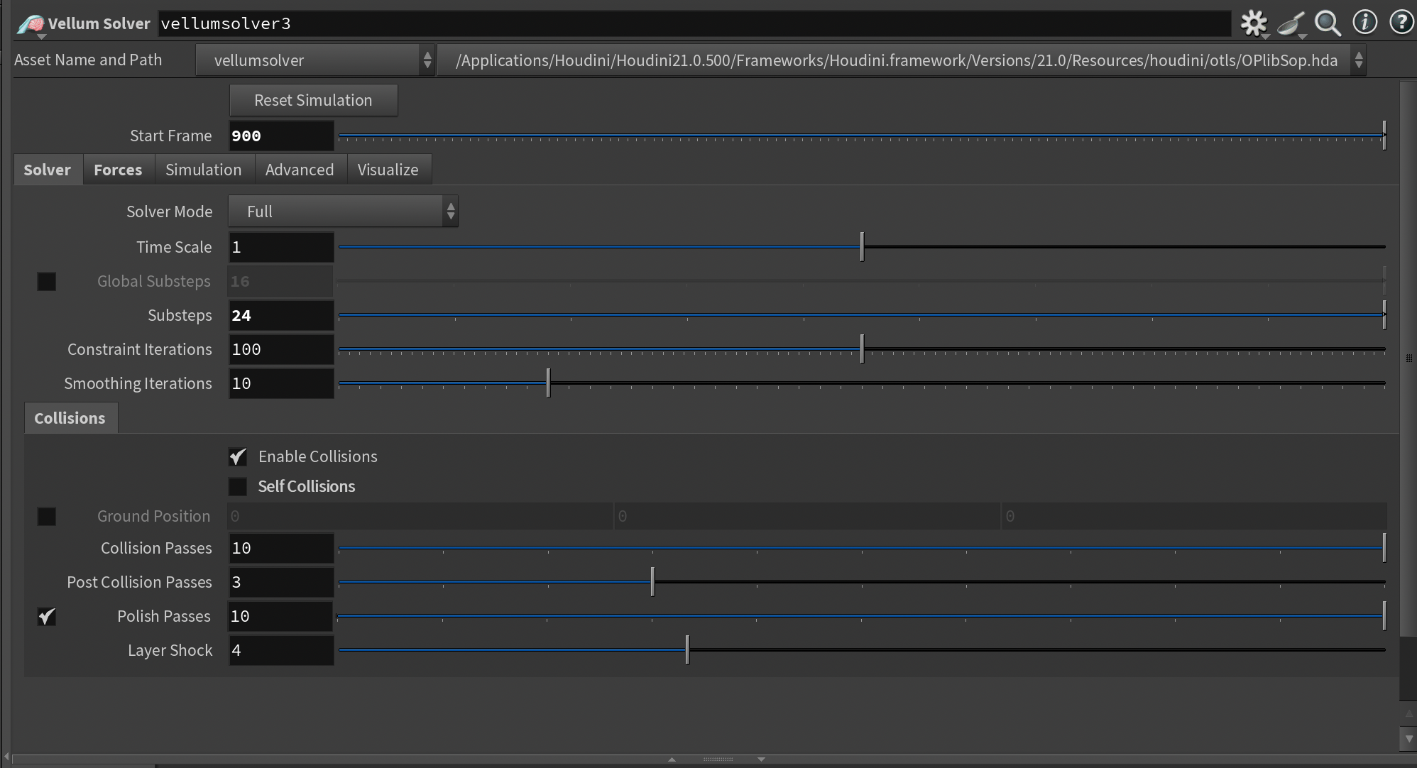 Now, regarding solver parameters I didn't actually modify much. Under the Solver tab I changed Substeps to 24 (you may need more depending on your input skeletons), and disabled Self Collisions. Depending on how close you get, you may benefit from self-collisions, but in my scene, I found it unnecessary.