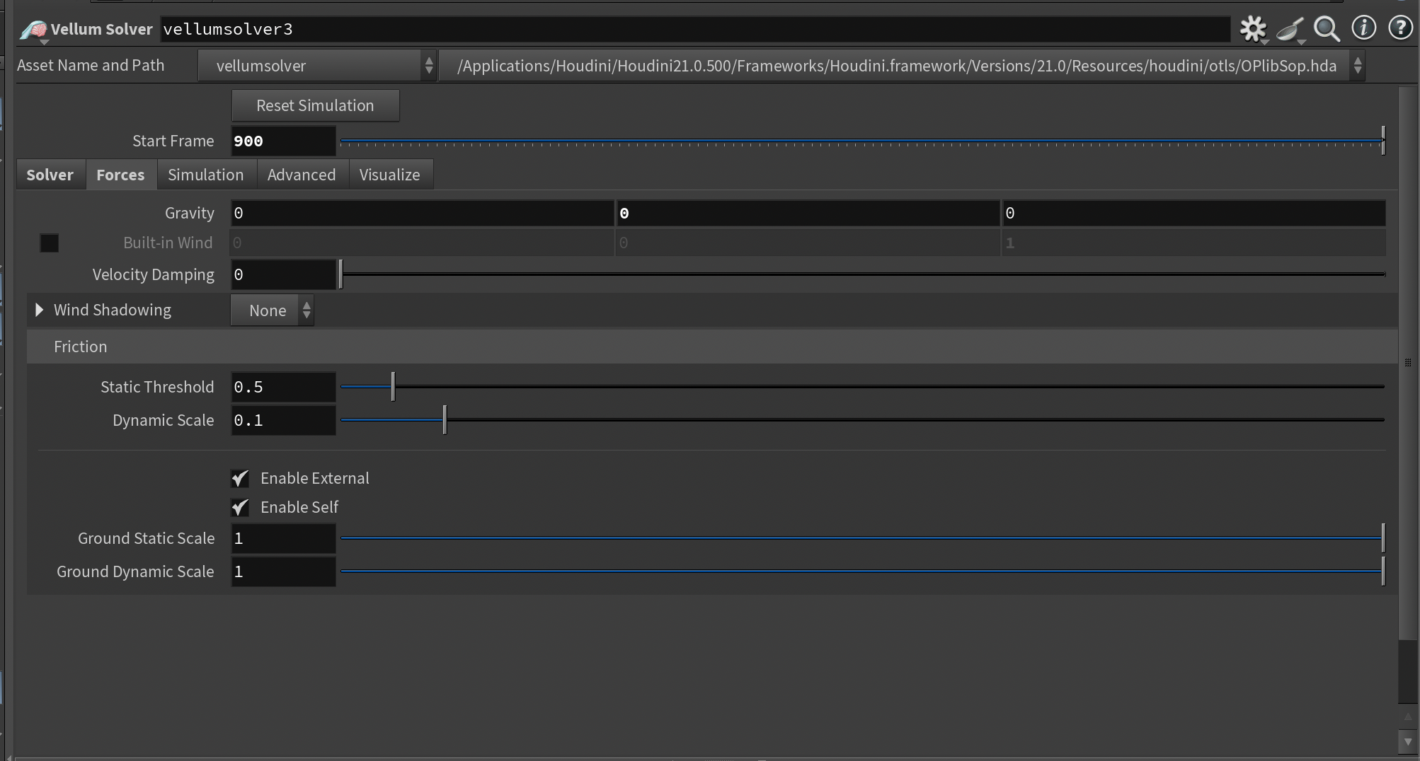 Under Forces, I also set the Gravity to 0 so none of the vegetation would start drooping. You could also adjust the vellum constraints further to avoid this, I'm sure, but I found this setup to be the easiest in my case.