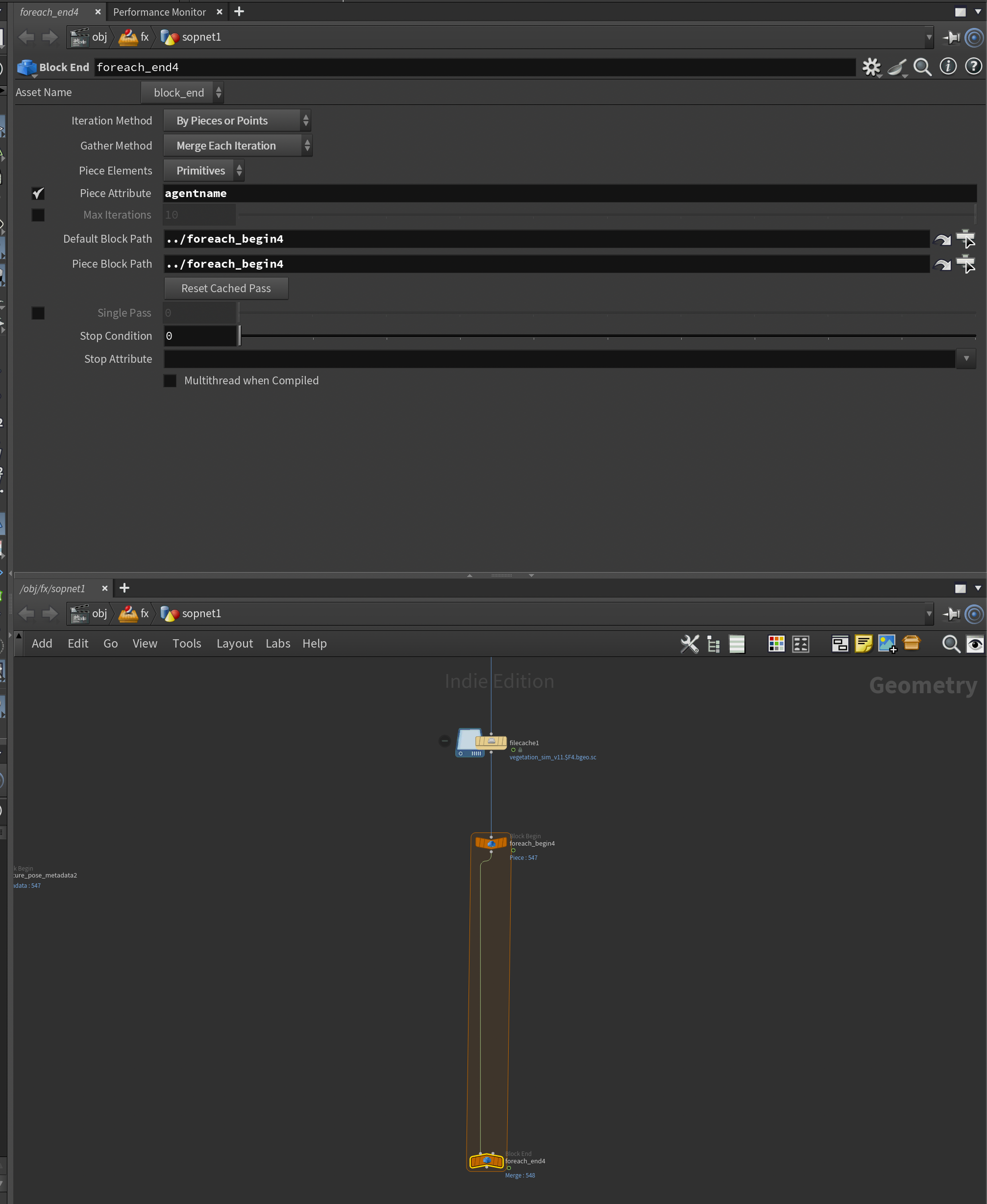 Create a For-Each Named Primitive connected to our cached simulation and change the Piece Attribute to agentname. This will cause the For-Each loop to run over each agent in our vegetation layout (we created a unique agentname for each vegetation element earlier in the article when we imported the vegetation from LOPs).