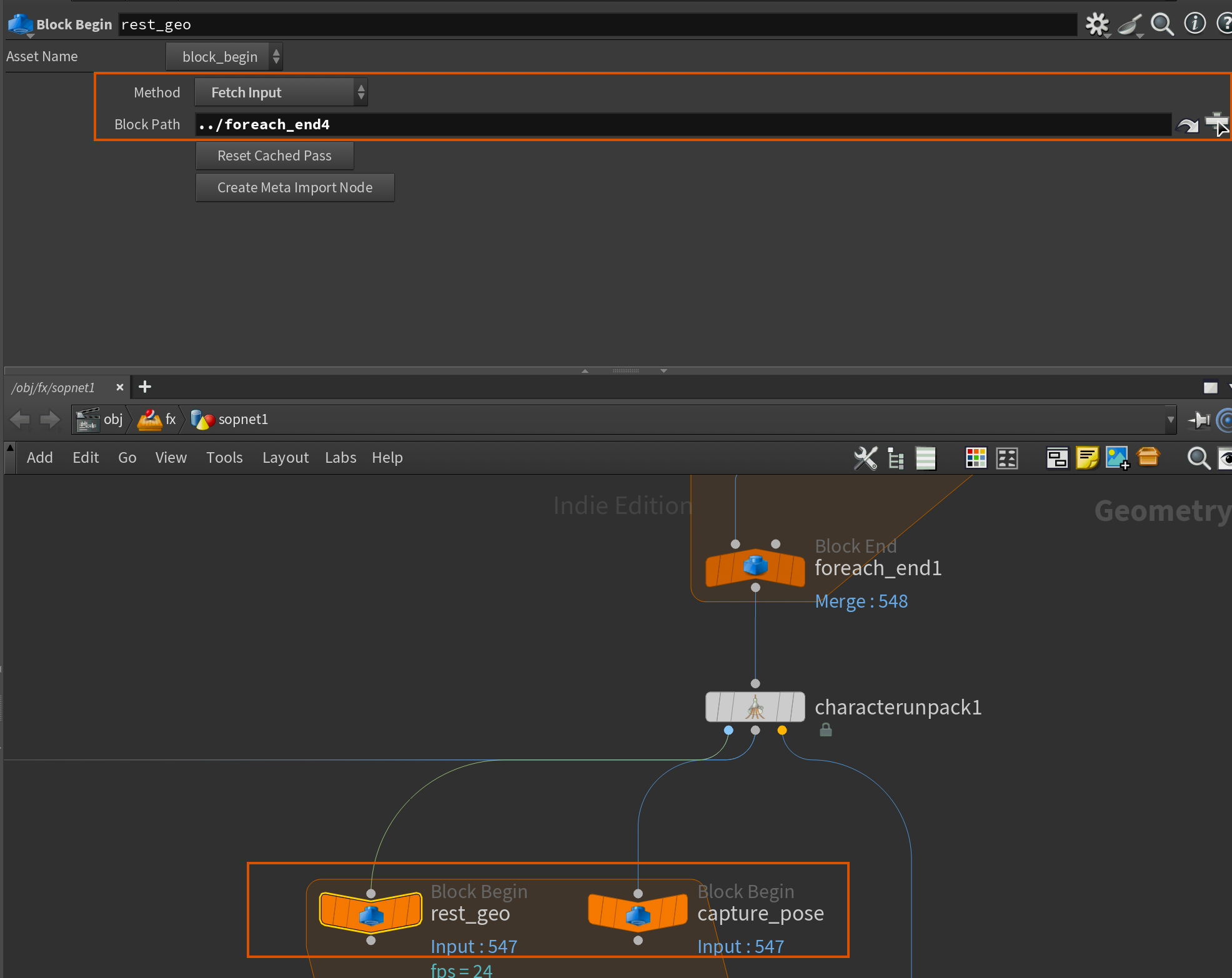 Now, we also need 2 more Block Begin nodes set to Fetch Input . We need this in order to fetch the rest geometry and pose for each vegetation agent. I've named them accordingly in my scene and connected them to the respective outputs from the Character Unpack node earlier in the graph. See screenshot below. We also need to plugin the path to the For-Each End node. In my case it's called foreach_end4. You'll know it worked if you get an orange border around your new Block Begin nodes.