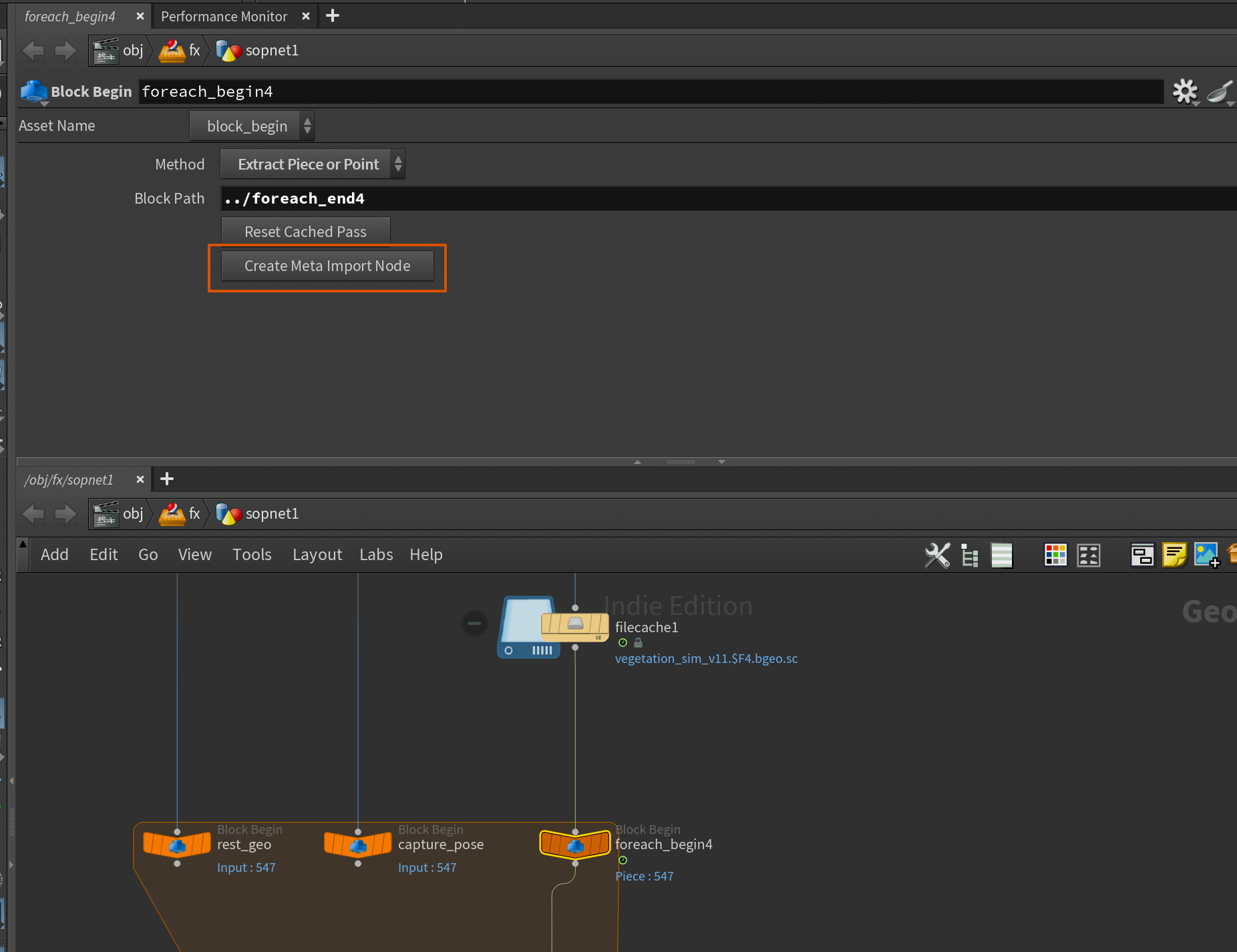 At the moment these nodes will simply grab every single capture pose and rest geo, but we need to isolate only the ones we need for each iteration. In order to do this we need to create a Meta Import Node. You can do this by selecting the original For-Each Block Begin node and clicking Create Meta Import Node .