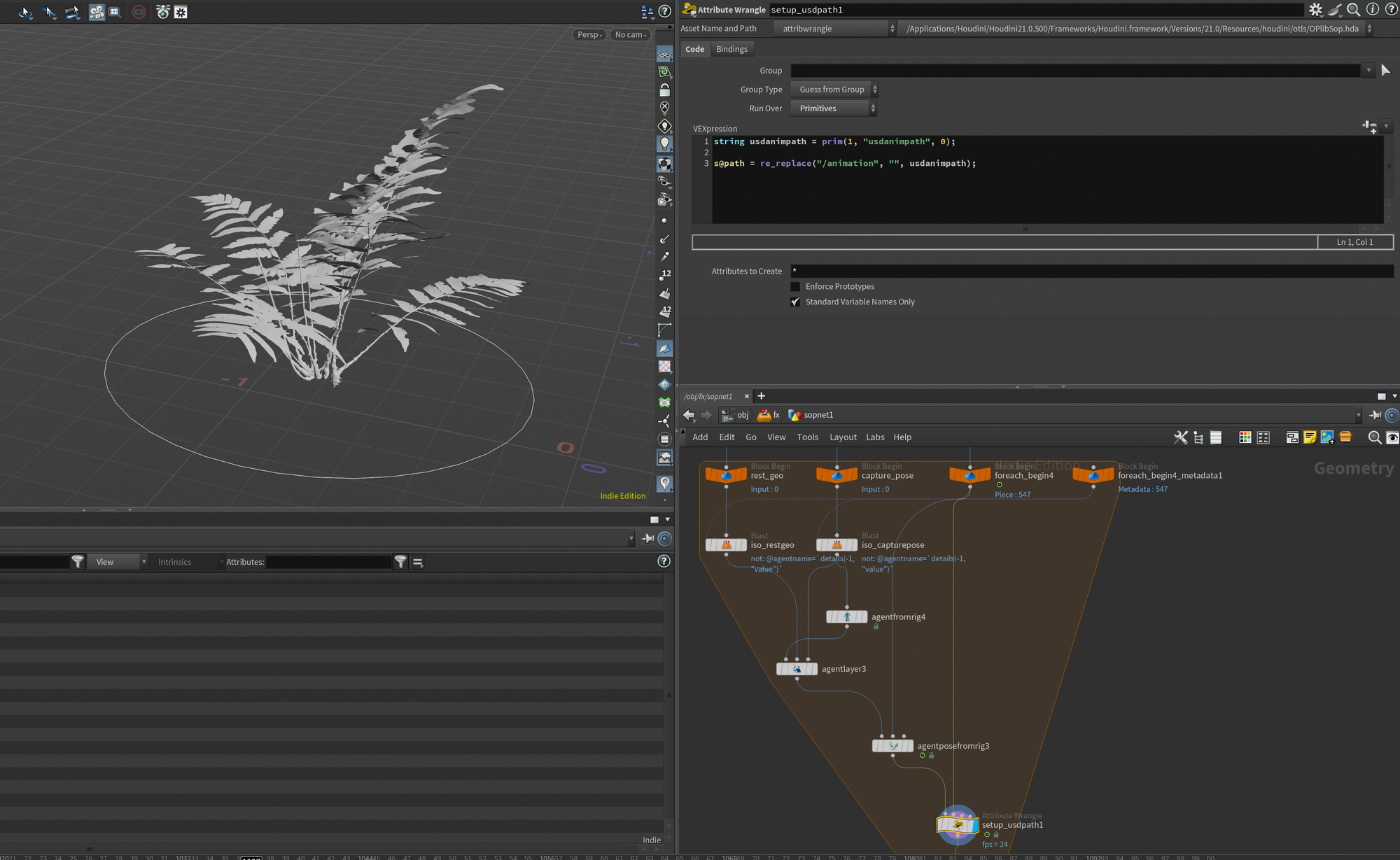 Character Pack and Wrangle.Finally, before plugging the result into the For Each End, I added a Wrangle. I'm doing this to extract some additional information from the LOPs. In particular, I'm looking for an agentname (a unique name we'll use to identify each piece of vegetation).