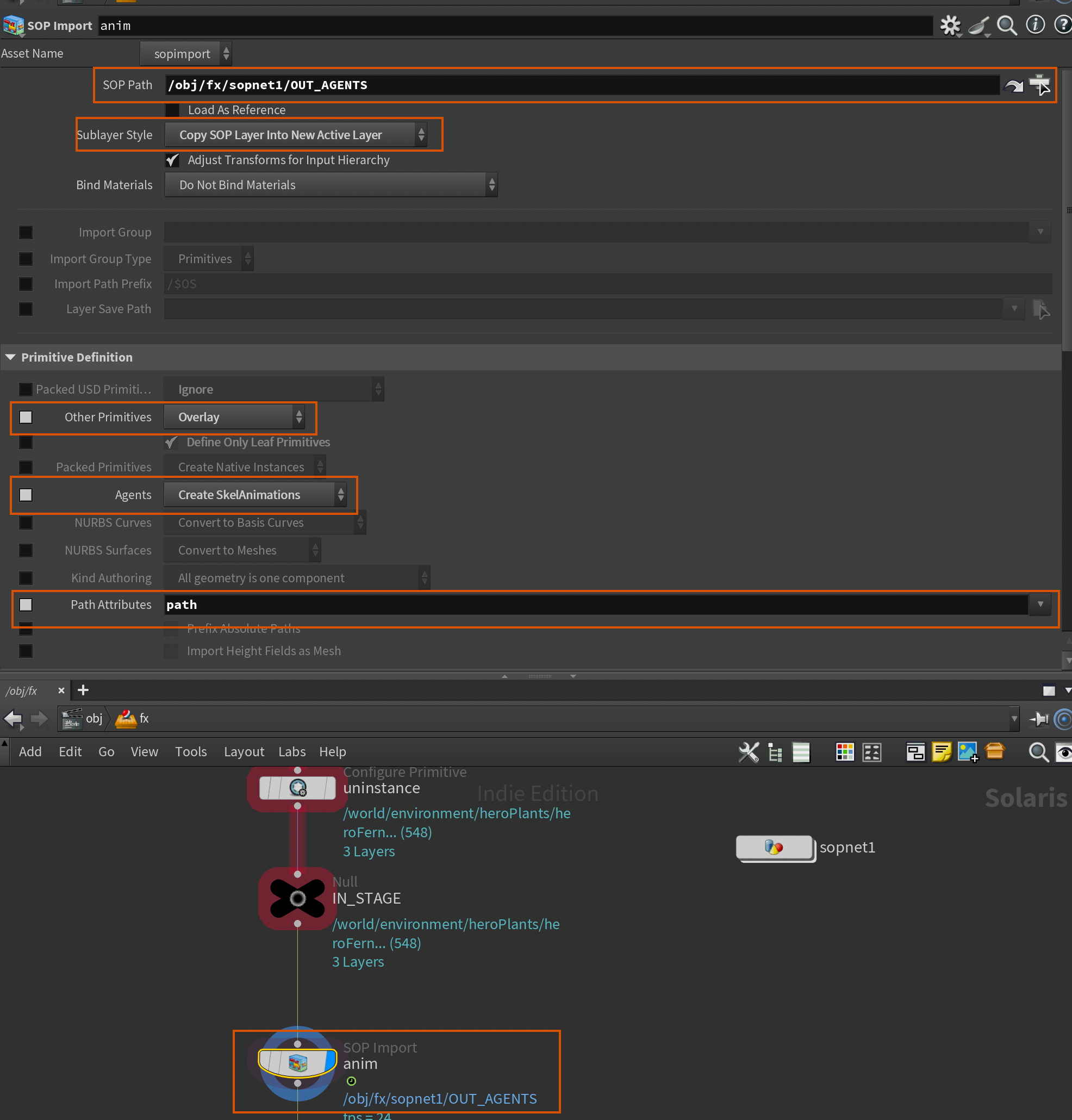 To do this you can drop down a SOP Import after the IN_STAGE and modify a few parameters. Mainly you need to change the SOP Path to the OUT_AGENTS null we created in the previous section, set the Other Primitives to Overlay so that we don't start creating any new primitives - we just want to override our data onto existing primitives. Set the Agents to Create SkelAnimations (since we only want the animation data to layer on top of our existing UsdSkel Agents), and finally set the Path Attributes to path so it reads our path attribute from SOPs.