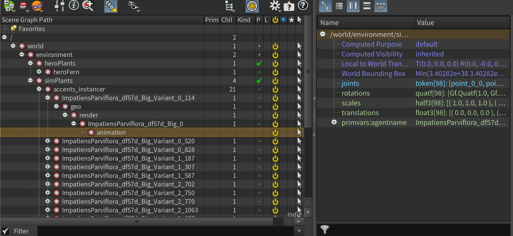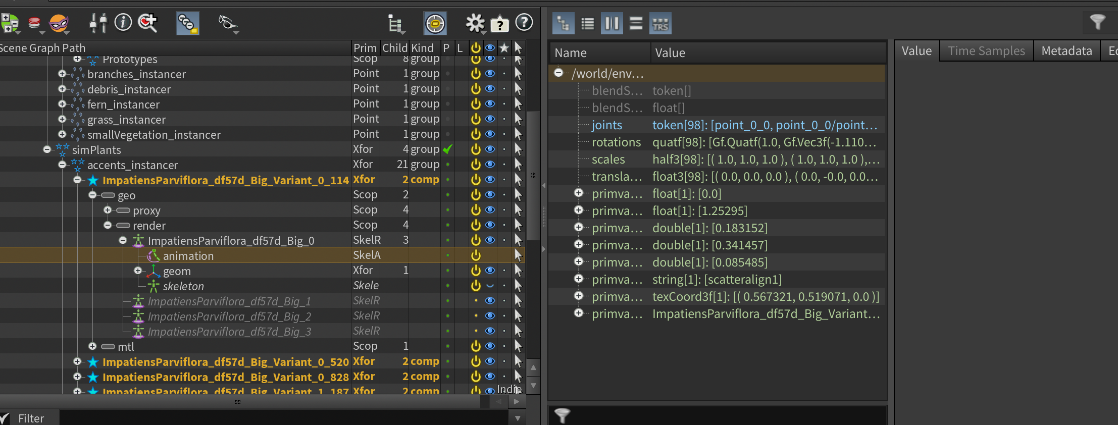 With this added you should now see your SkelAnimation primitives under each piece of vegetation populate with time sampled rotation, scales, and rotations. And the vegetation should be moving if you start a render (since we only have animation on the render purpose primitives).