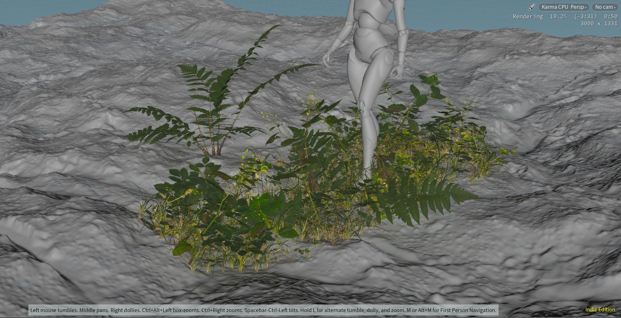 Before jumping into the layout, I loaded in a bit of motion capture I recorded for this demo and attached it to Electra. I also created a simple ground to scatter vegetation on top of. If you'd like to use this as a base for your own tests, I've provided a hip file with the setup below, as well as the motion capture data (ground + motion capture + camera).