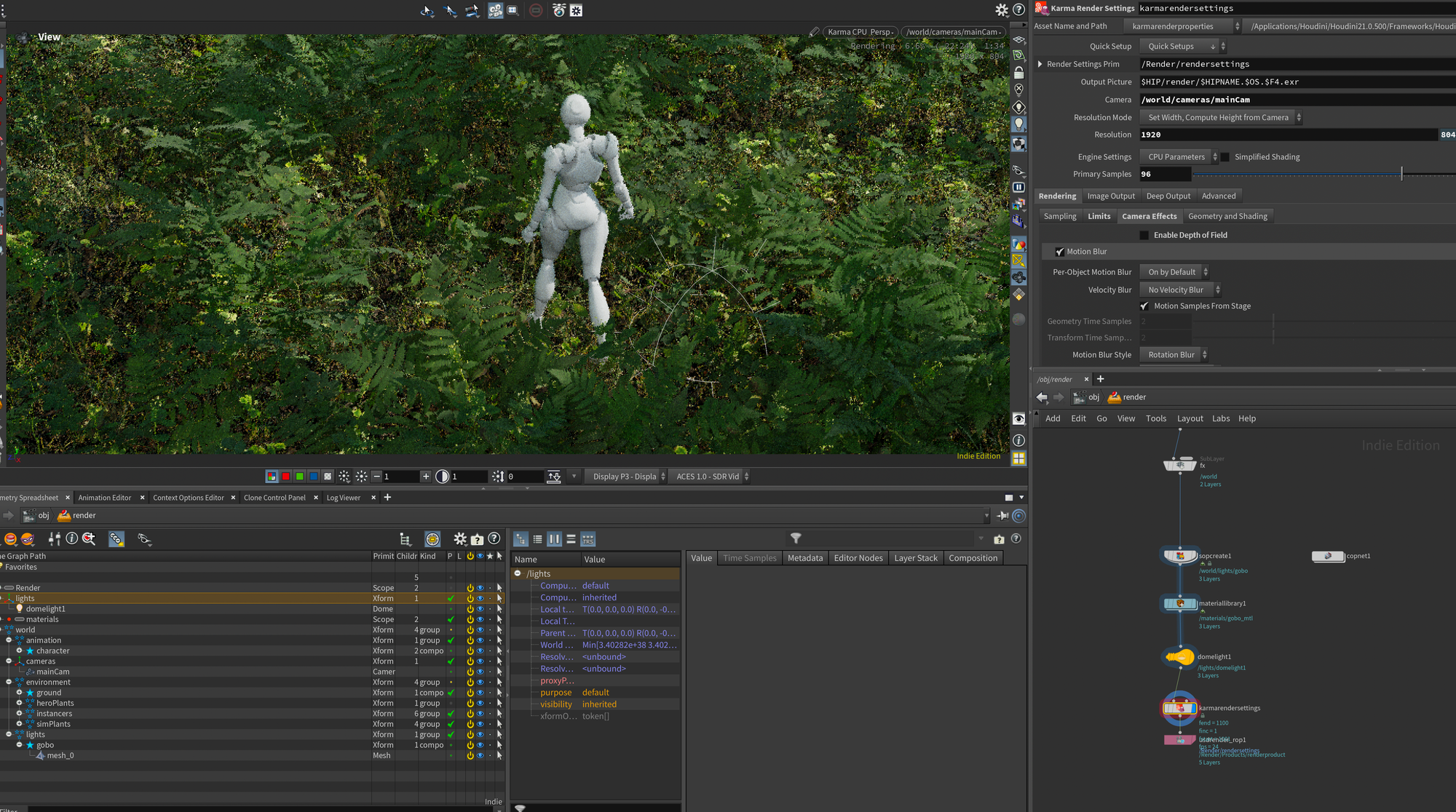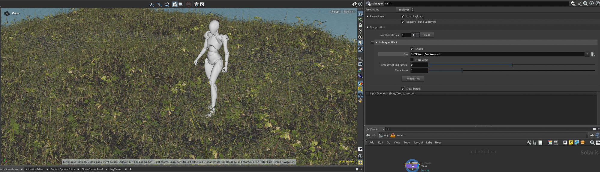 Please note that I exported all 3 elements (ground, character, and camera) to a USD file called main.usd before continuing. As seen in the export LOP network in /obj of the file above.