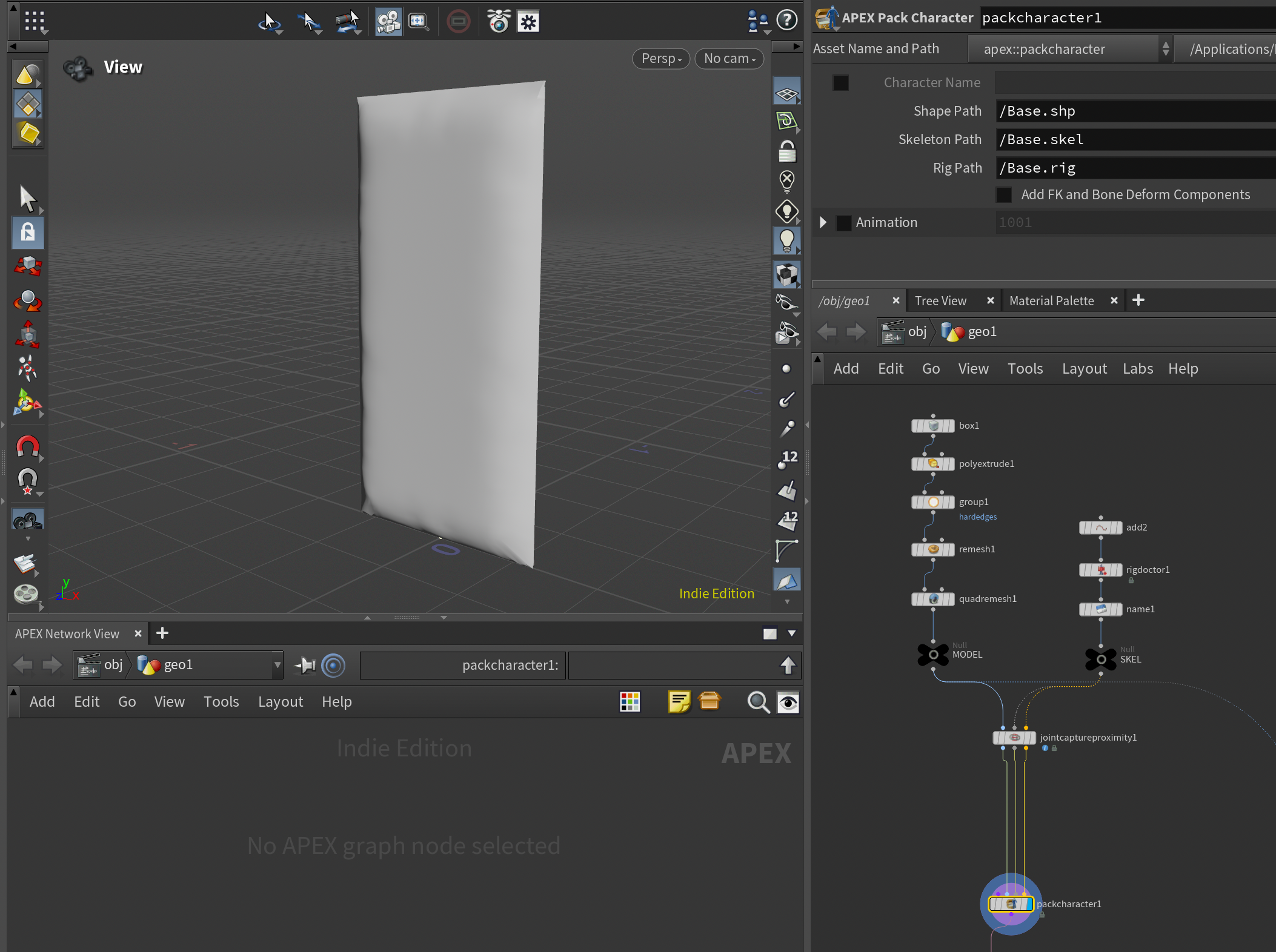 My pillow rig consists of a single control called root, placed at origin, and bound to the pillow mesh using a Joint Capture Proximity SOP. I've then piped the 3 outputs of the Joint Capture Proximity SOP into the new Pack Character node (this is a new simplified way of packing a character for APEX rigging).
