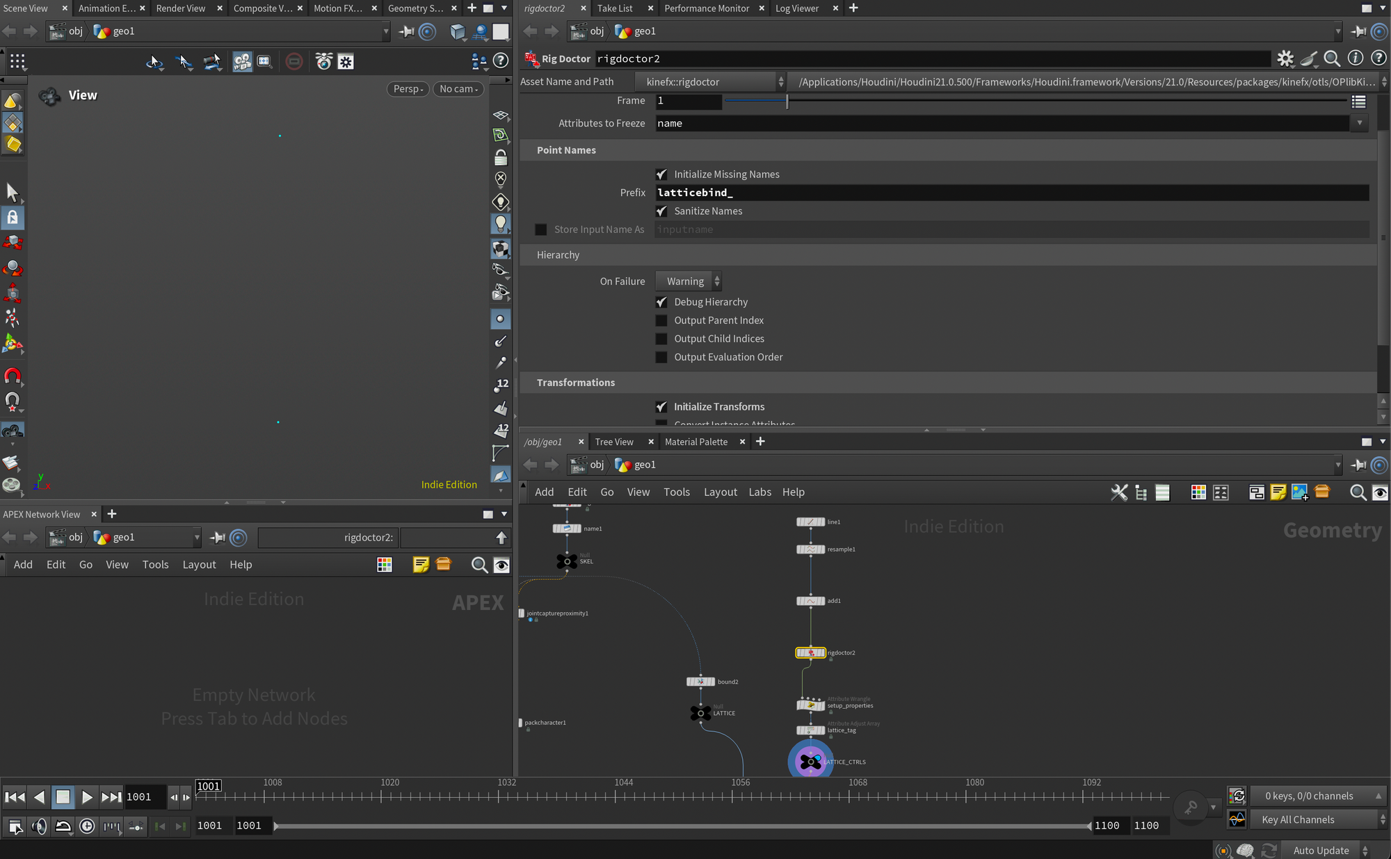 For the lattice controls I created two points at opposite ends of the lattice. It's up to you how you want to add them. After creating the points I turned them into proper joints by adding the Rig Doctor node and turning on Initialize Transforms. Also note I set the prefix of the joints to lattice bind_ in the Rig Doctor.