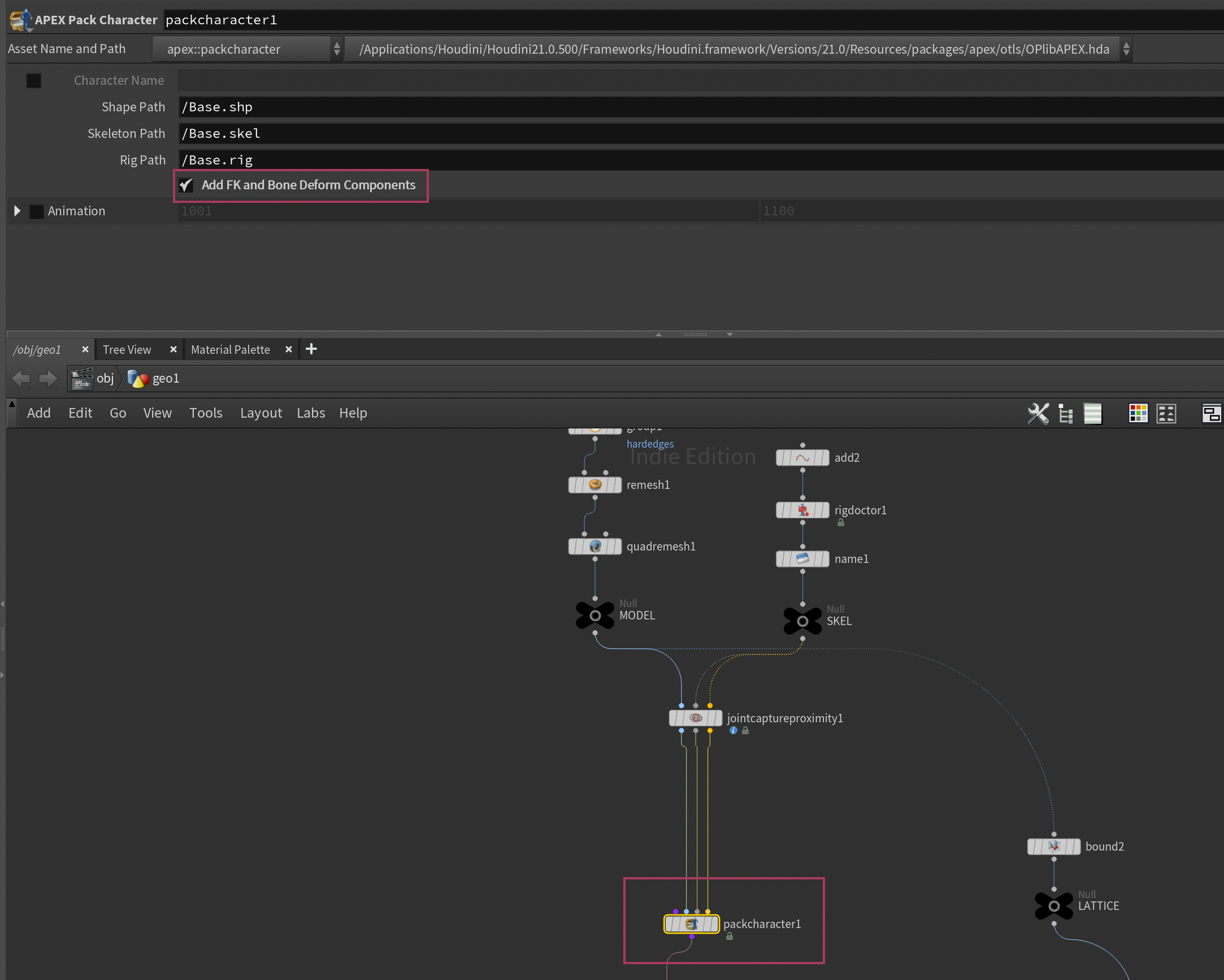 Since this is an action you perform so often when setting up APEX rigs, SideFX actually made an even faster way to do it now, directly in the APEX Pack Character node. If you go back to the first APEX Pack Character we made (the one with the root joint and pillow mesh) you can turn on Add FK and Bone Deform Components. This saves you the extra step of having to add them yourself after.