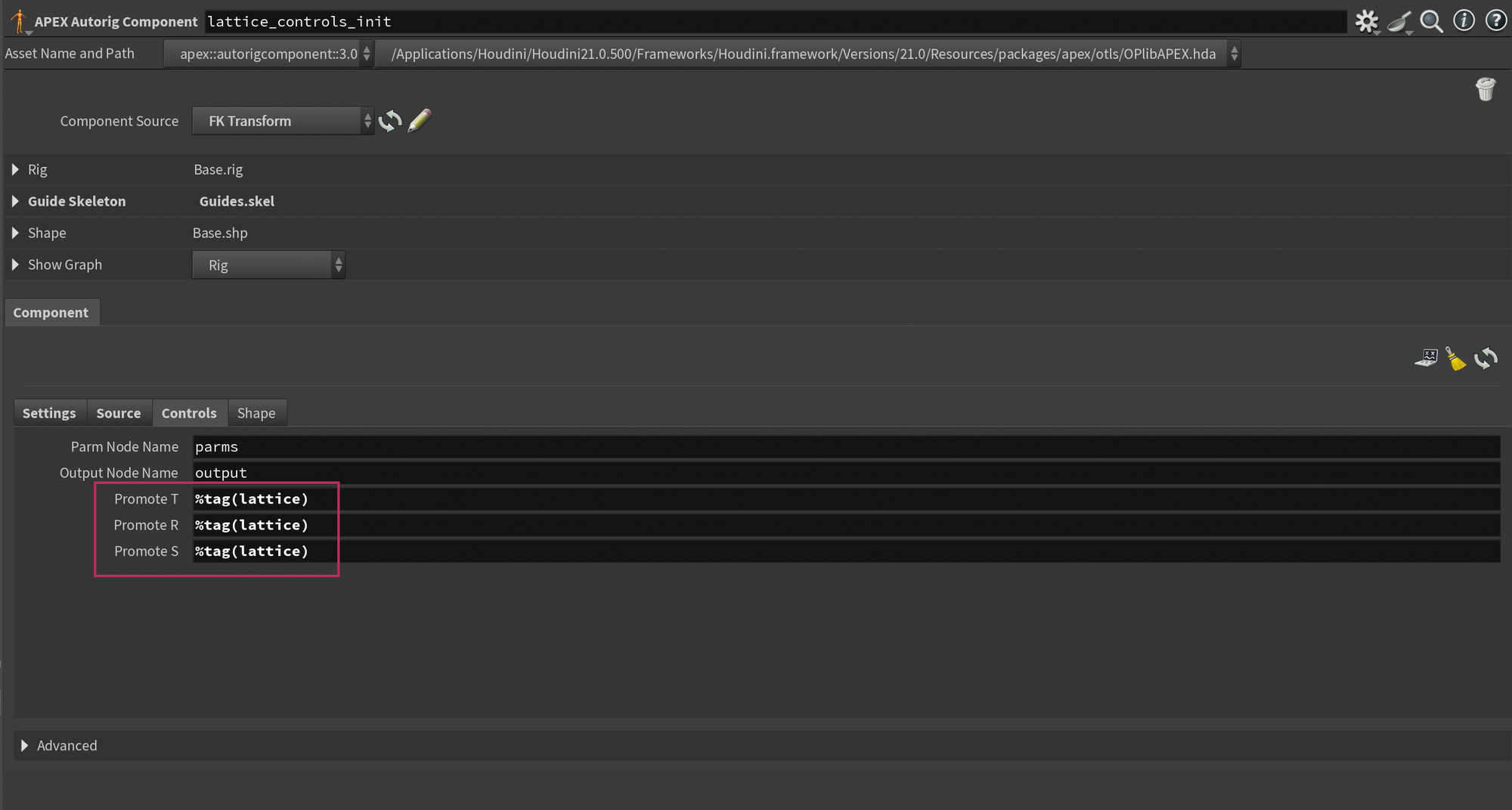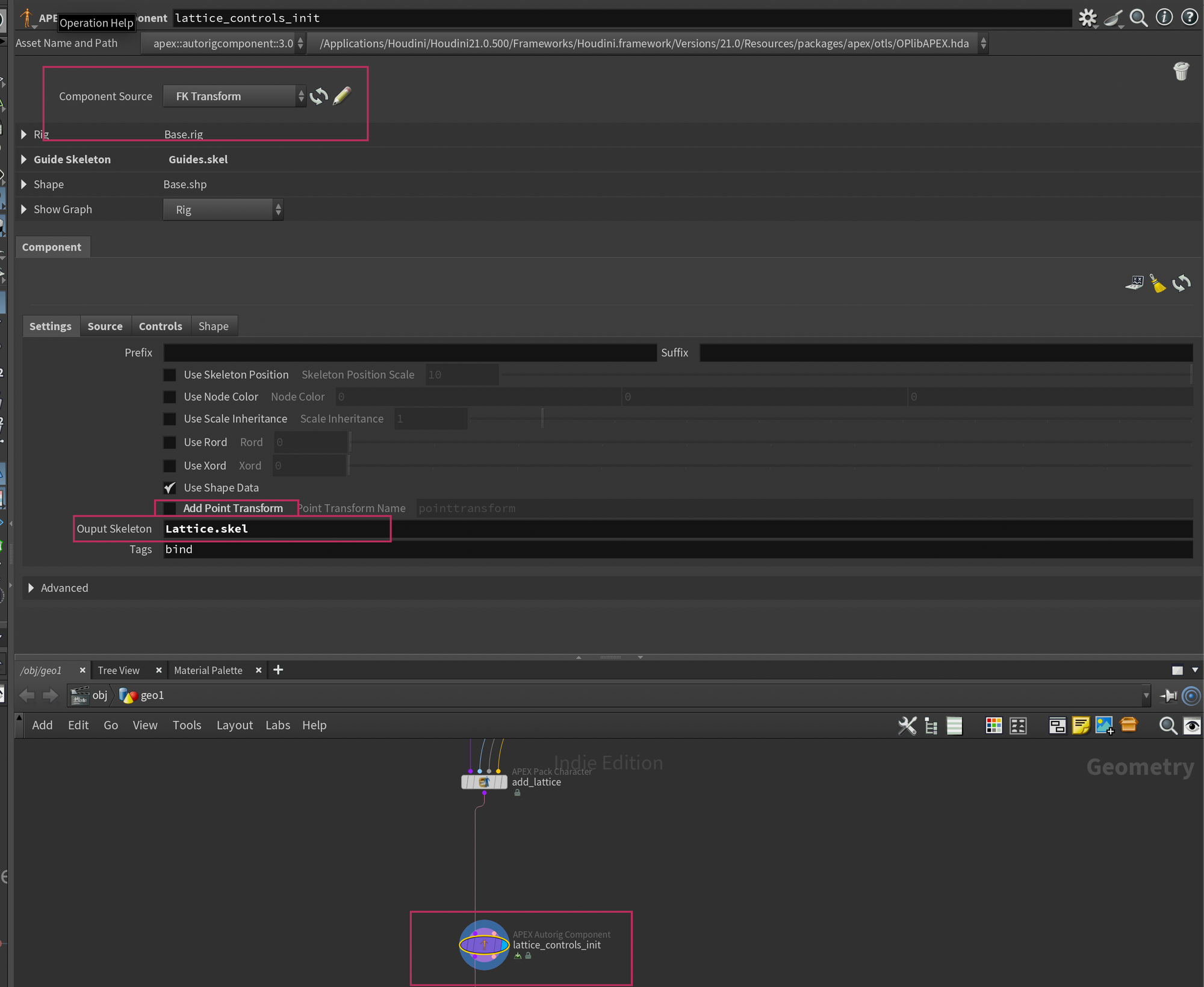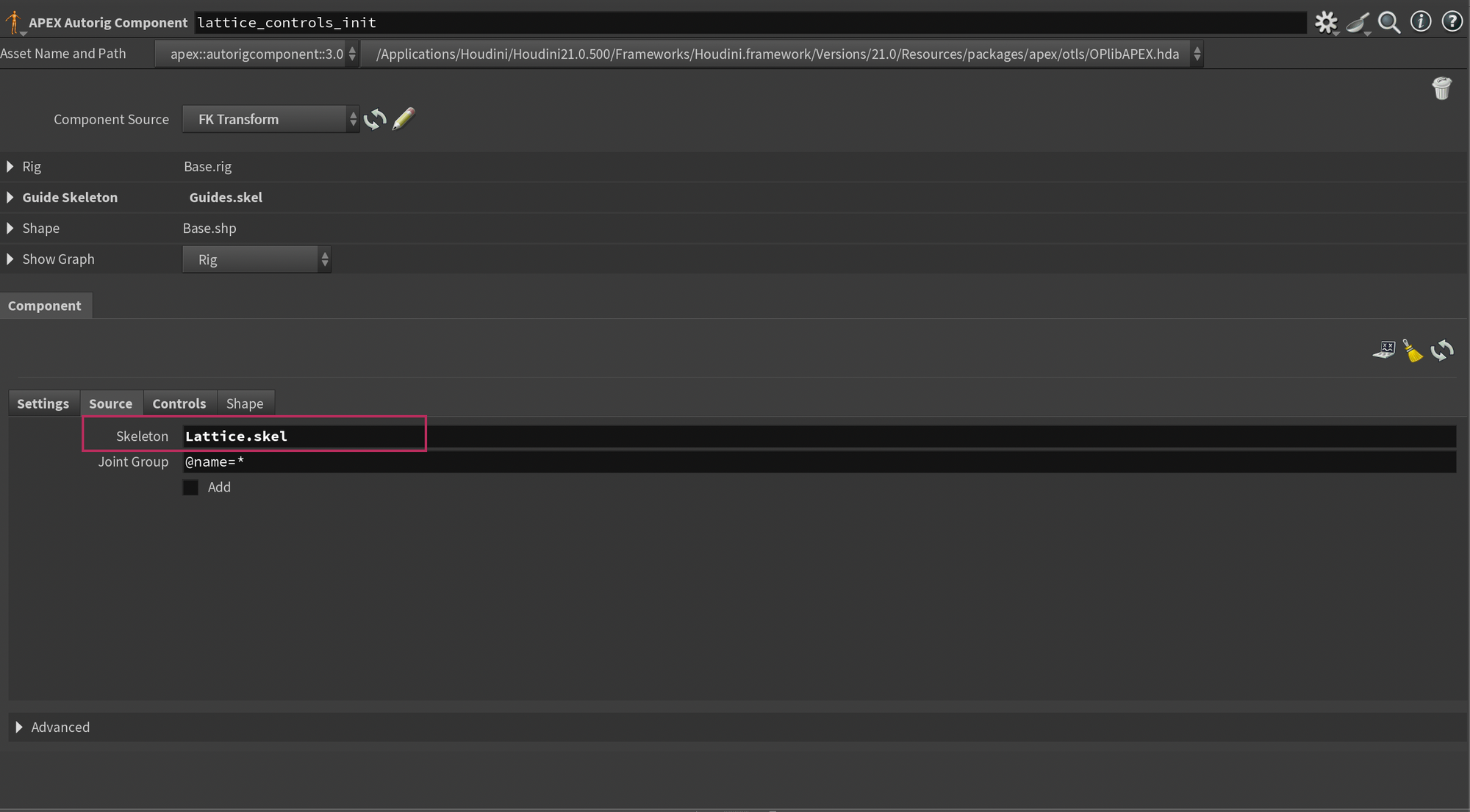 Drop down a new APEX Autorig Component and set the component source to FK Transform. Next, on the Settings tab, set the Output Skeleton to Lattice.skel (this is the name of the skeleton element containing the lattice controls). You'll also need to disable Add Point Transform as my script takes care of that part.