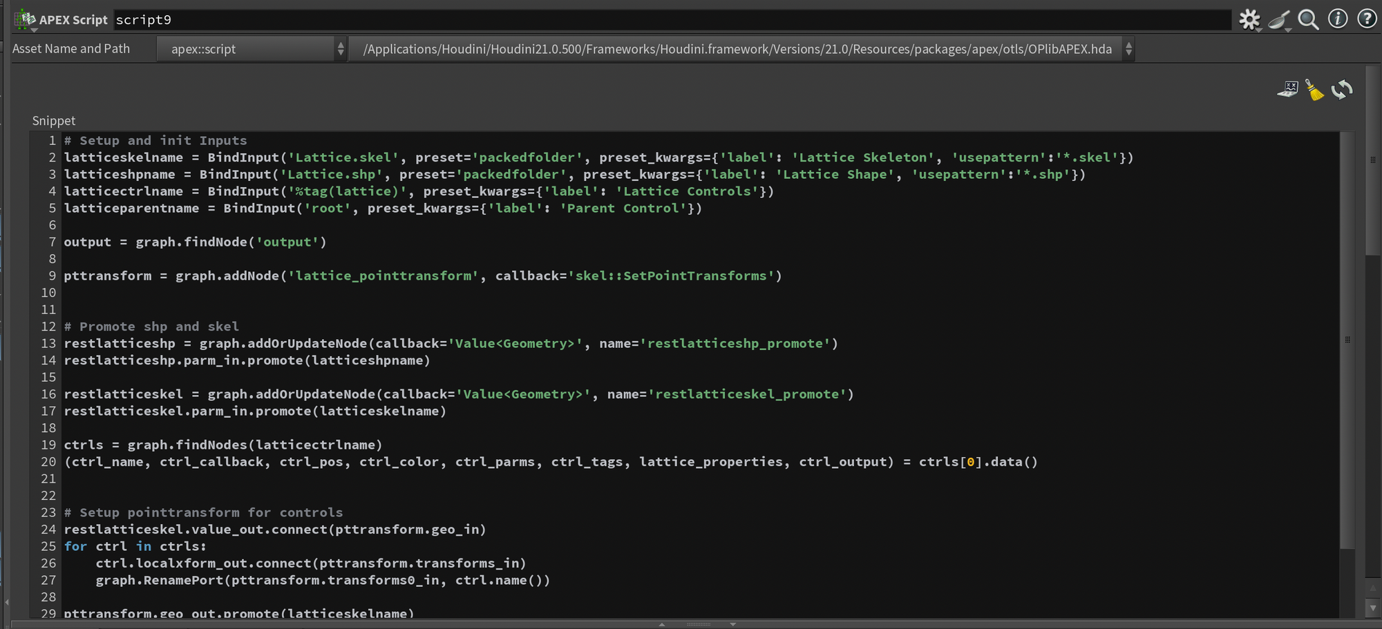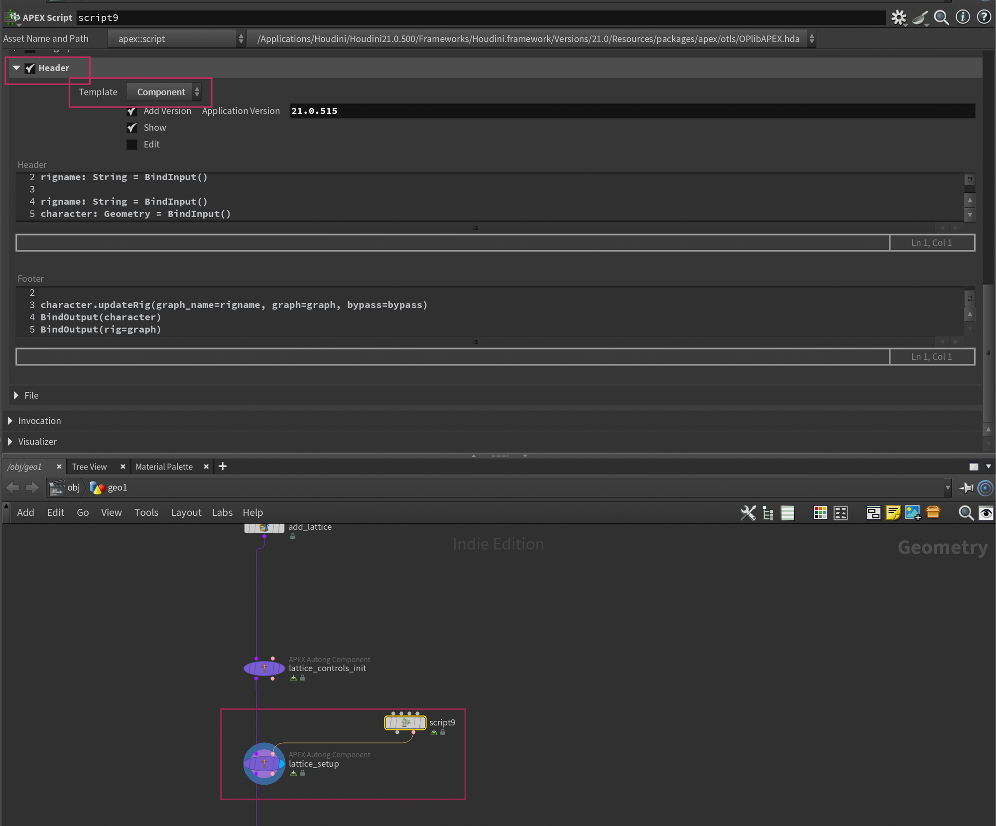 Now we only need to add the custom lattice rig component and we're done. Drop down another APEX Autorig Component and set the Component Source to Use Second Input. Then, drop down an APEX Script node and paste the following code into the Snippet section.