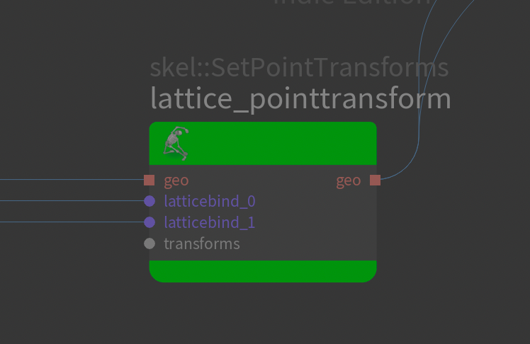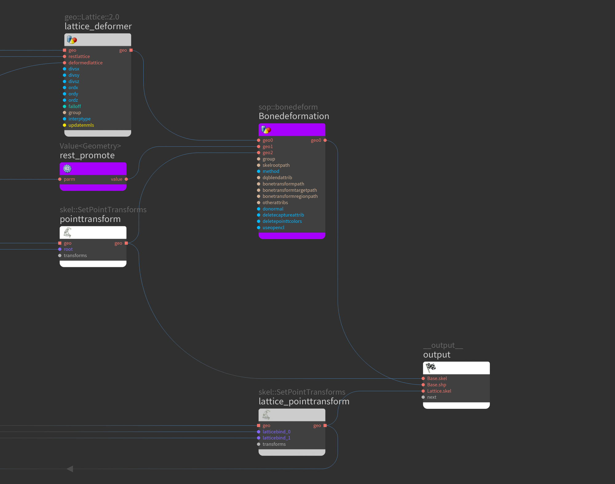 restlatticeshp.value_out.connect(bonedeform.geo0_in)Next we setup a custom bonedeform node for our Lattice. This is what will deform our lattice mesh using the lattice controls. We connect the Lattice.shp to the first input, the Lattice.skel to the second input (rest Lattice.skel), and the deformed Lattice.skel (the output from our SetPointTransforms) to the third input.